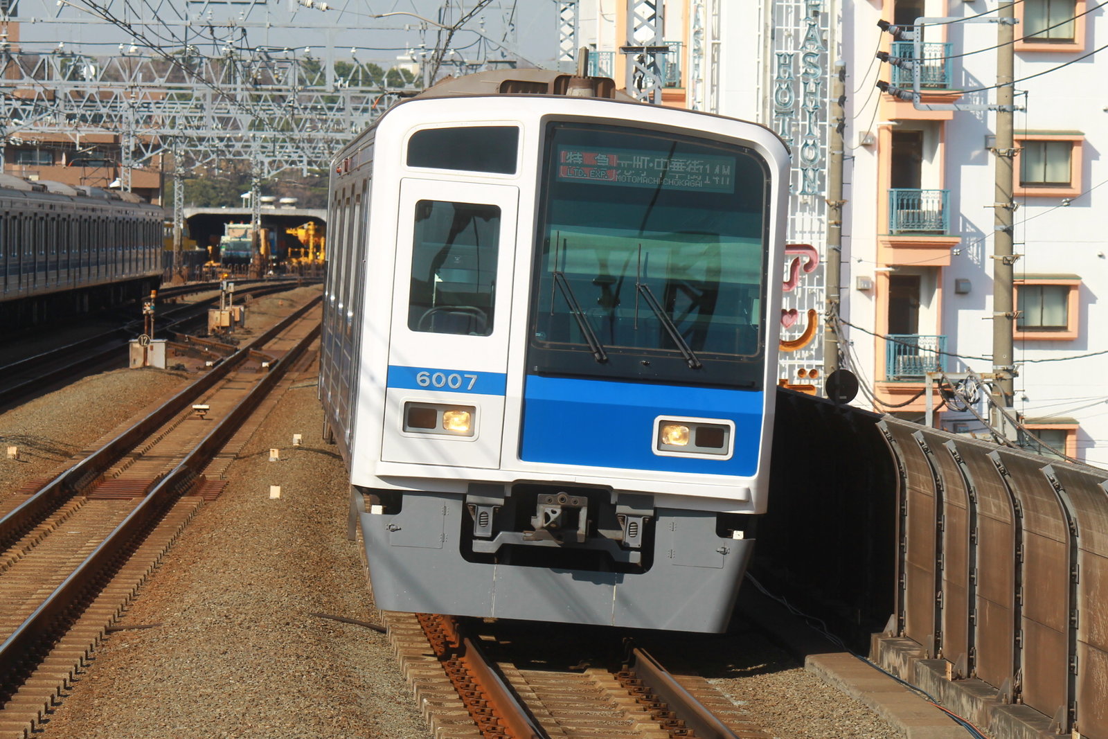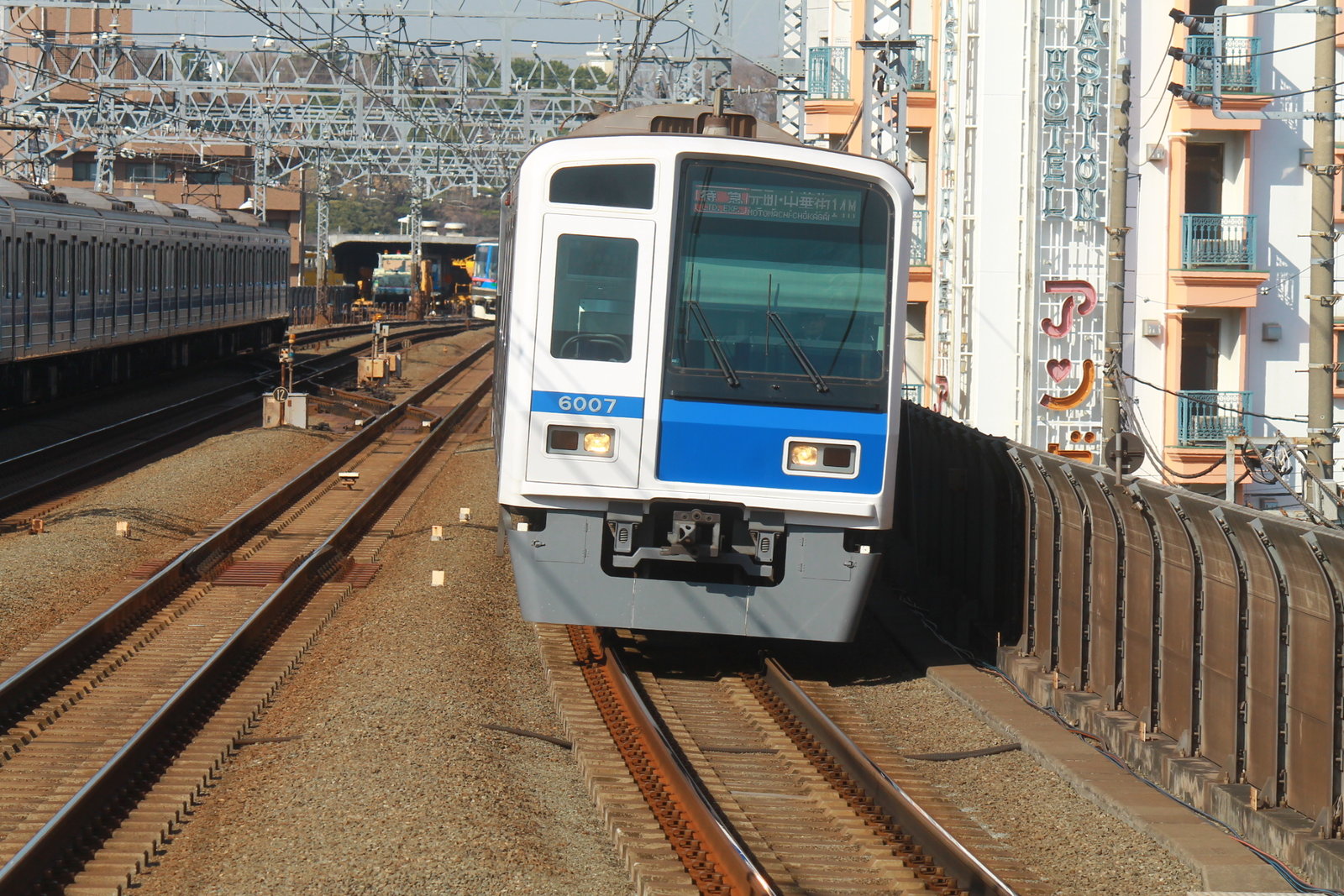 何かサプライズな列車が来ないかどうかカメラを向けることにした。来てしまいました!西武の車両の特急元町・中華街行き。西武の車両は6000系が充当される。まさか西武の車両が長年線路が手前で止められていた多摩川を越えてくるとは!!!西武鉄道といえば、自分は京成電鉄の次に好きな私鉄で、子供のころから所沢や田無、飯能などへ行くときによく乗っていた鉄道路線であるが、まさか神奈川県川崎市中原区で見るとは思わなかったね!!