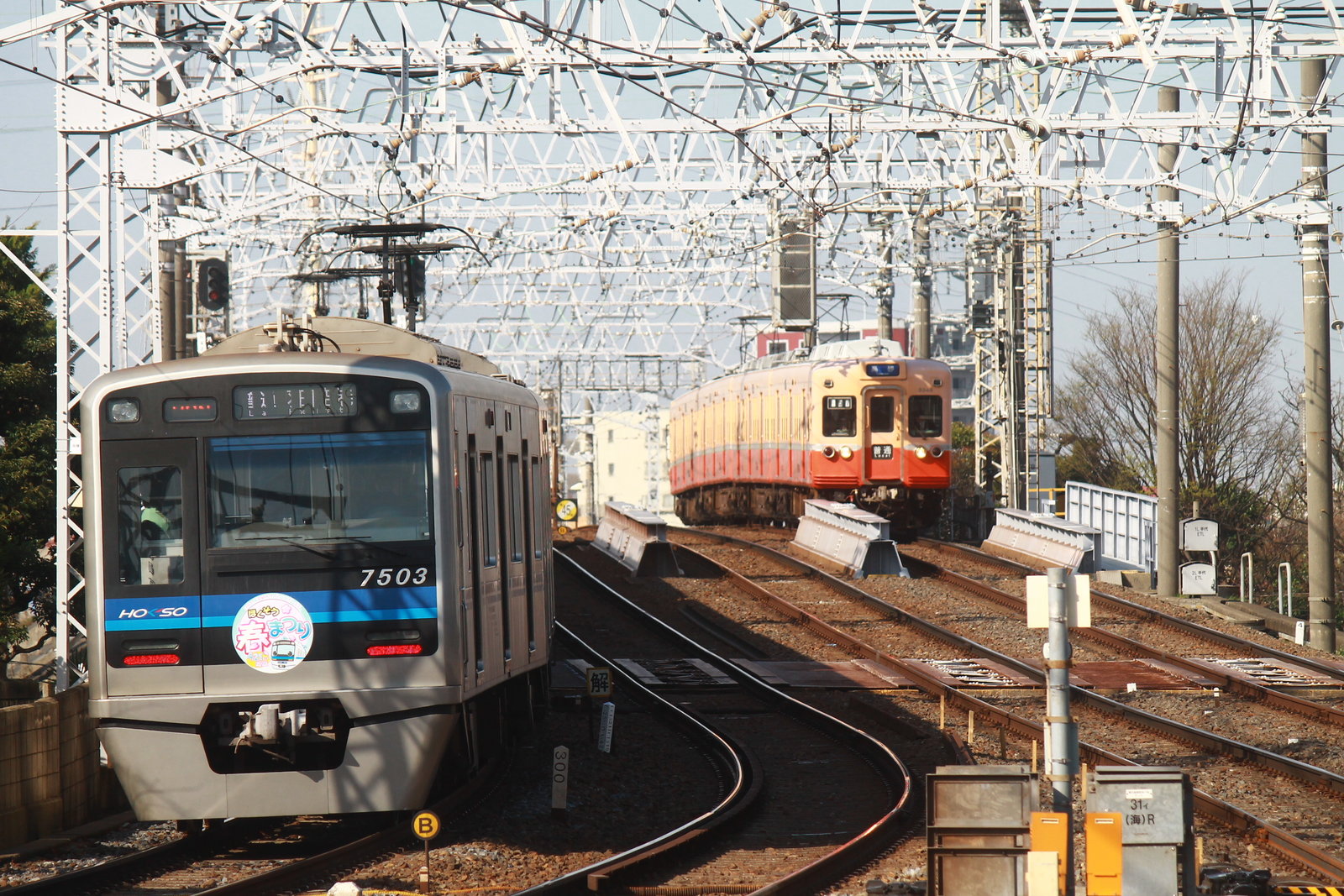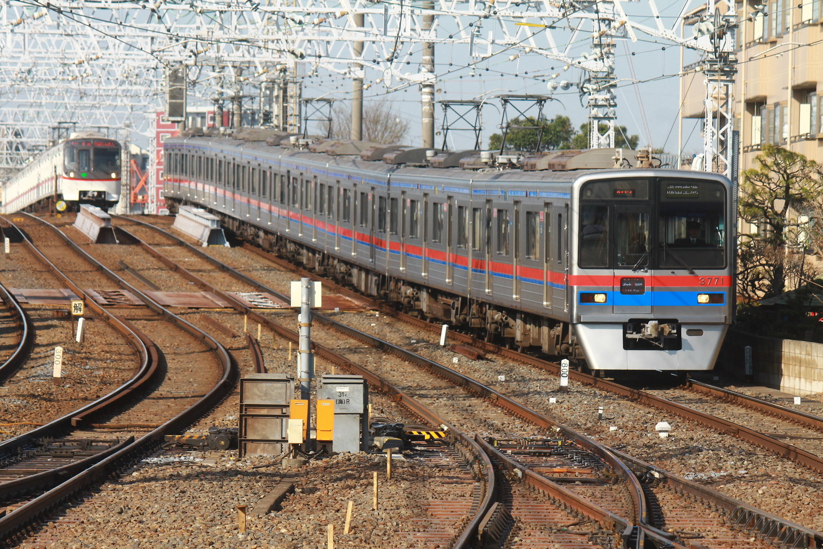 京成グループ標準車両として2006年〜07年に3本が製造された7500形。デザイン的には大先輩に当たる京成3300形とのすれ違いがここでは最後かもしれない。京成の新旧の姿を現しているようだ。3300形が押上線に入らなければ、3300形と7500形の共演は青砥〜高砂間の複々線でしか見ることができない。