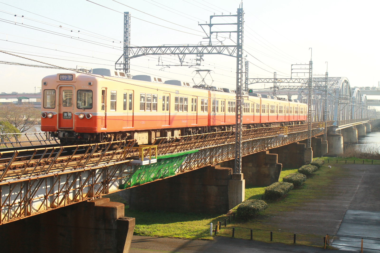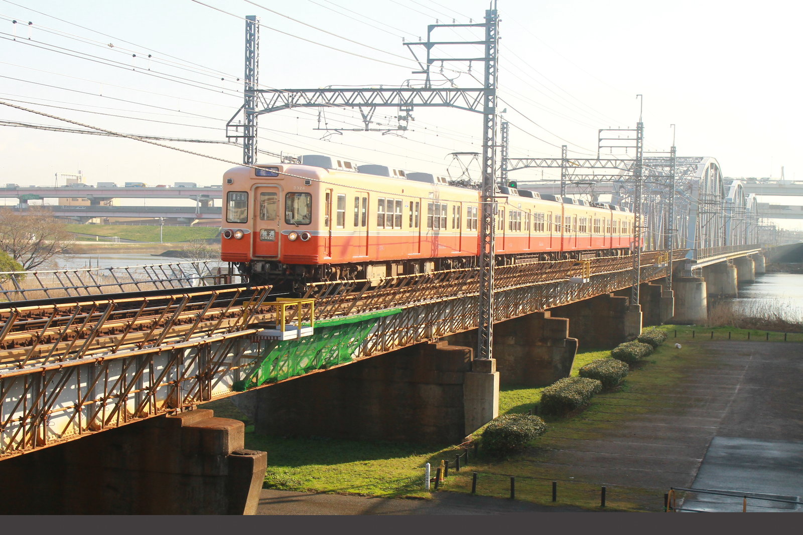 中川の橋へと望遠を使って撮影をした。ここでは、坂を下りる姿を撮りたいのだ。他の青電とファイアーオレンジではこのような構図の写真は存在をしたが、この色は存在をしなかったので撮影をしたかった。