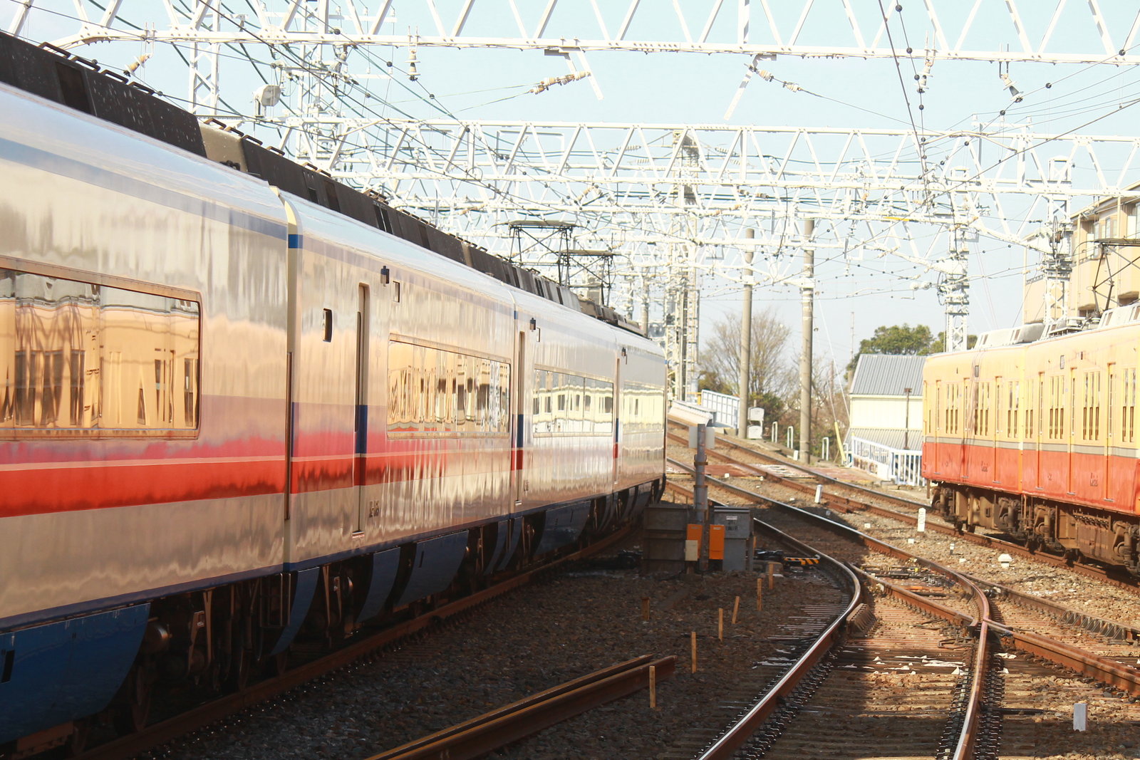 この時間帯は新AE形スカイライナーも多い。下り線が特に20分に1本で営業列車が多いのに、上り線は回送列車ばかりだ。上りは1本くらいはモーニングライナーとして走らせてもいいと思うし、成田空港に早朝に到着をする路線の対応としてスカイライナー2号の発車時間を繰り上げてもいいかもしれない