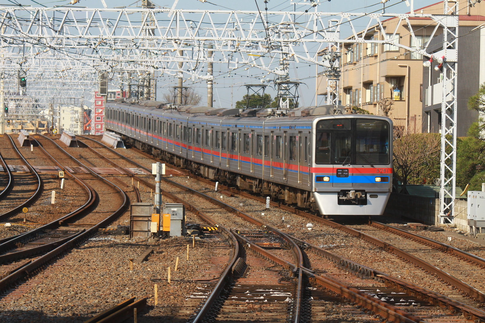 荒川のその先では、新AE形スカイライナーのスカイライナー9号とすれ違う。京成の往年の名塗装を纏った3300形の赤電塗装、そして最高速度160kmで成田空港と山手線のアクセスを40分で駆け抜ける新AE形スカイライナー。京成の新旧の組み合わせがここで実現をした。この数分後には、この高架の先でまたぐ東武本線には、赤電が関屋駅に停車をしている最中に半蔵門線の東京メトロ8000系と東武の特急スペーシアが通過をしていった。