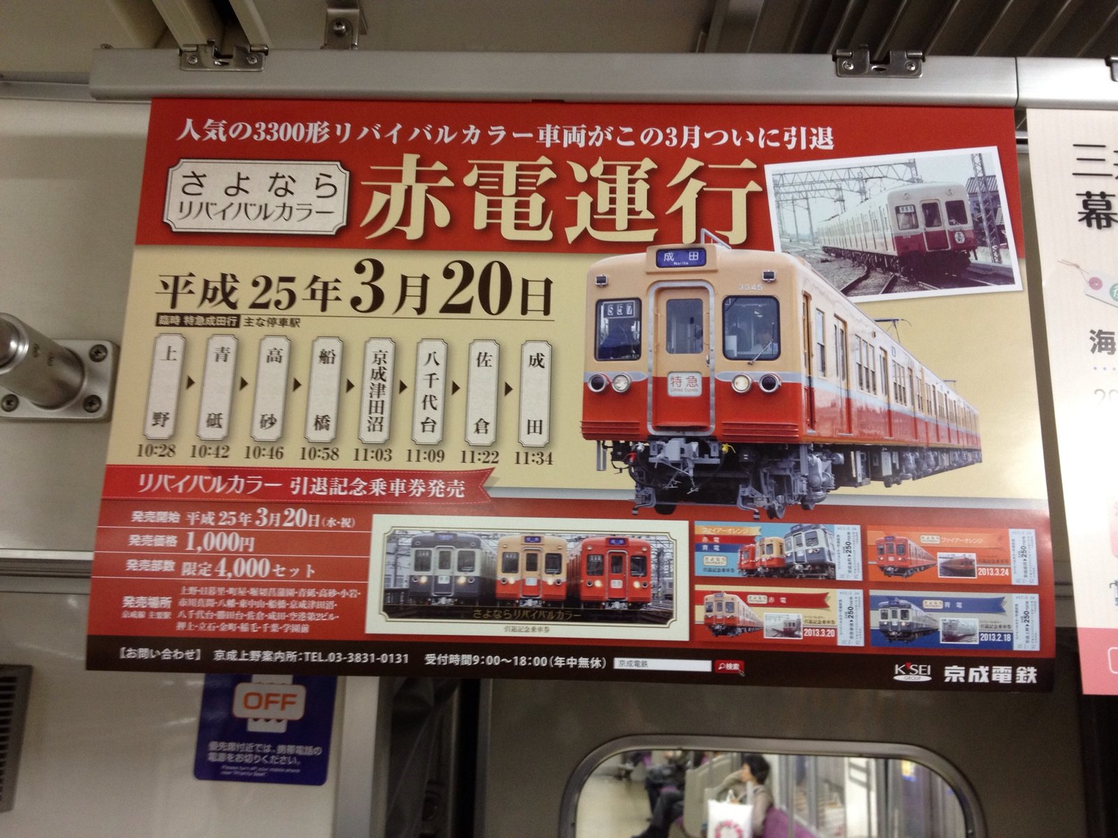 いよいよ20日はさよならリバイバル赤電として2009年8月から続いた3300形のツートン塗装は姿を消す。上野→成田間の特急として走る。最後まで無事に走って欲しいものだ。多くの撮影者が集まると思われるので絶対に運行妨害などの迷惑行為のないようにしてほしいものだ。