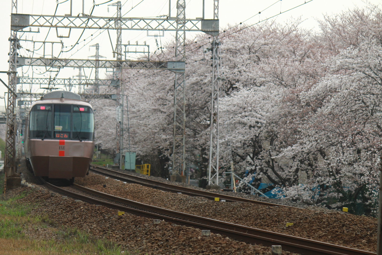 座間駅からは上り坂を15分くらい歩く。座間駅も桜がきれいだが、歩くことにする。タイミング悪く?はこね27号の7000形LSEロマンスカーが通過をしてしまった。大本命は狙いたいのは14時10分新宿発のはこね29号、VSEロマンスカーだ。