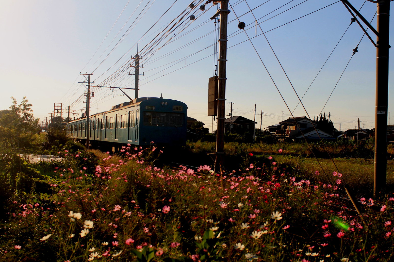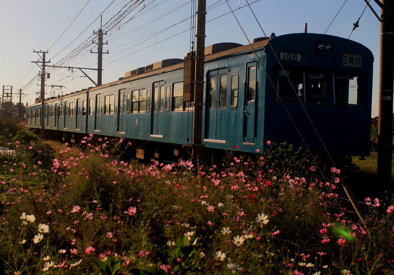 そして1000系のオリジナル塗装とコスモスの写真をこちらではお届けをする。1000系のオリジナル塗装は1000系の1010編成だけだ。
