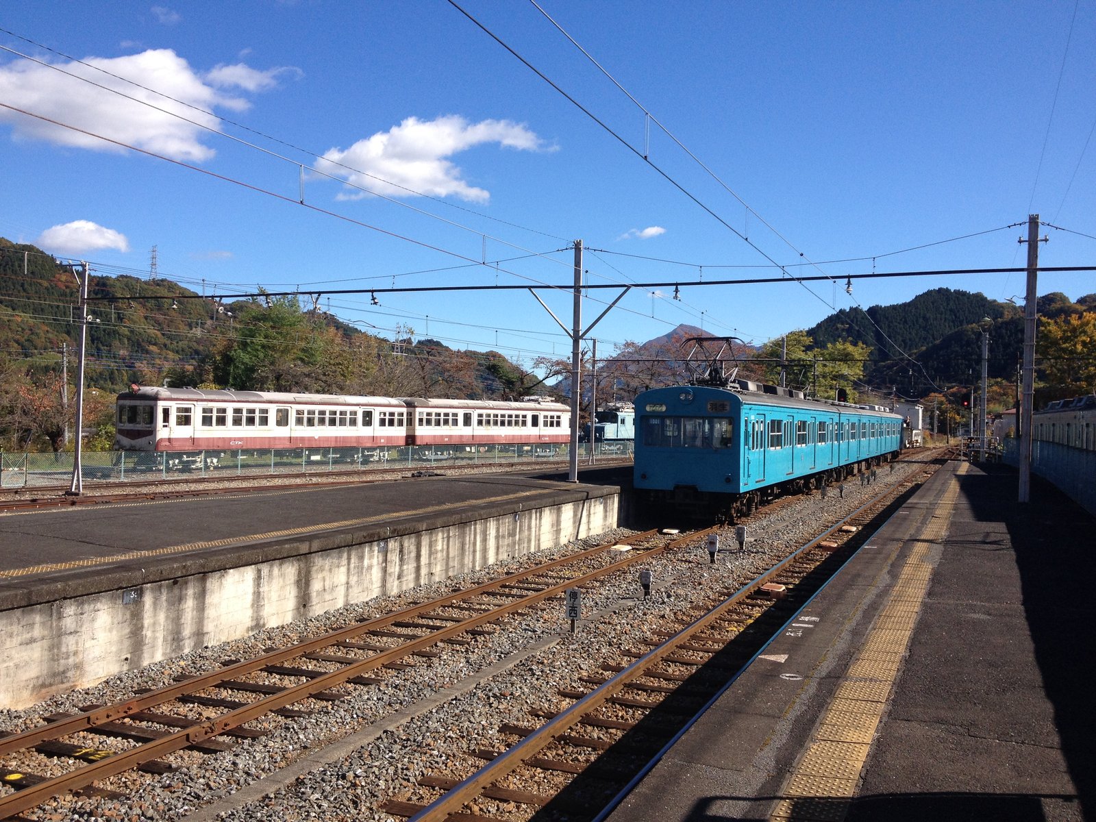 こちらは2012年11月10日に上長瀞駅の近くで撮影をしたものだ。紅葉の時期であったので、紅葉と1000系のスカイブルーの姿を撮影ができた。よくわからないかもしれないが、これは荒川の鉄橋を越えるシーンだ。