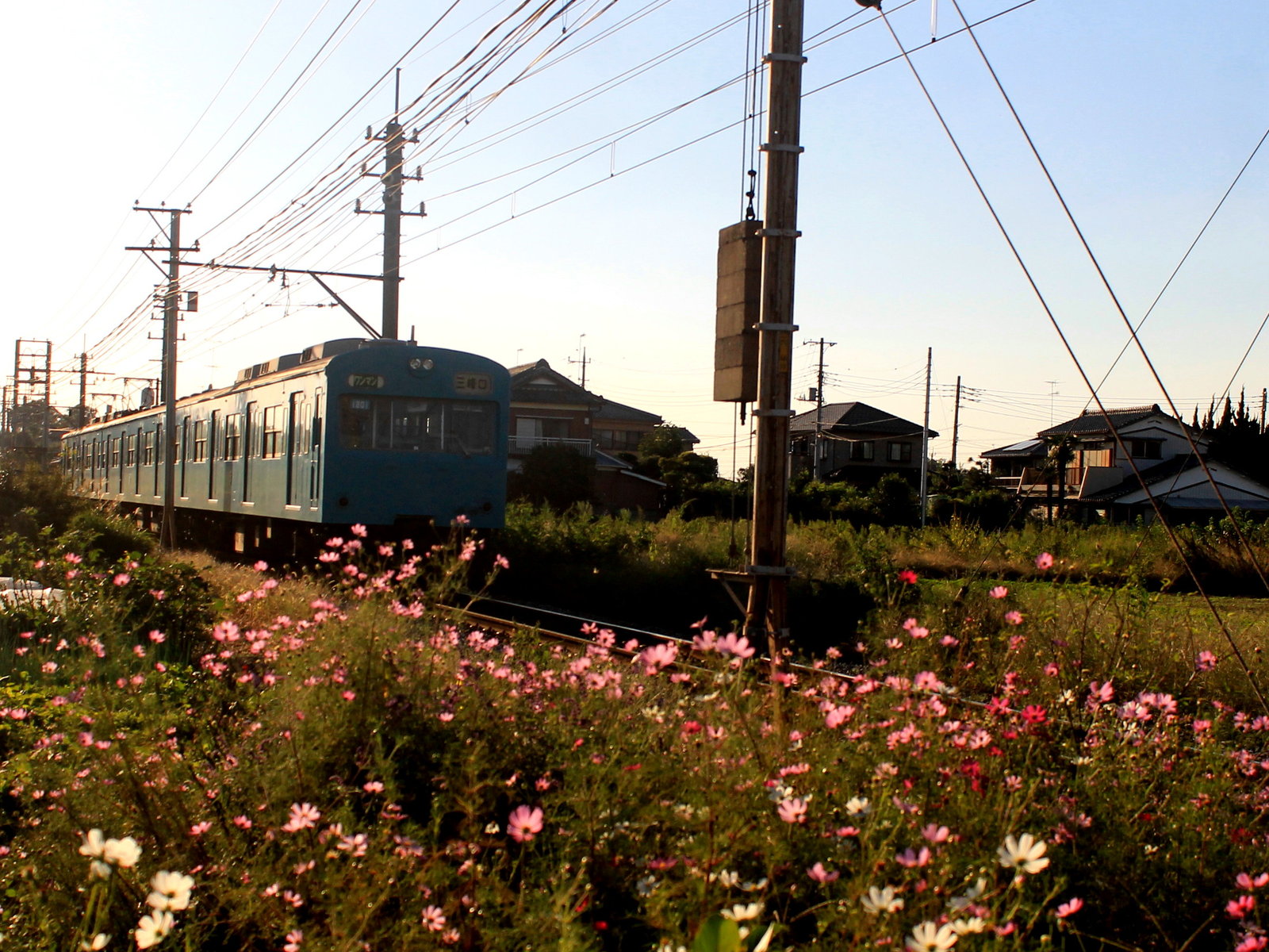 こちらは9月29日に大麻生駅の付近で逆光になりながらもコスモスと1000系の写真を撮影をした。例え逆光でも、コスモスと写っている姿はこの時期らしいものなので、撮影をした。
