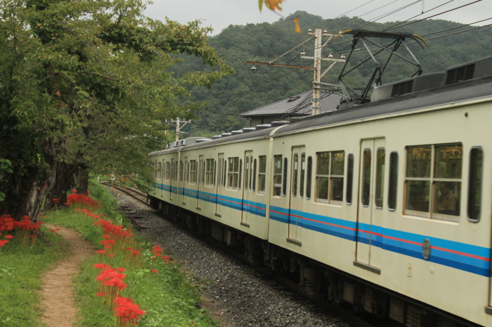 こちらは、後追いで撮影をしたものだ。彼岸花の赤と緑、水色が光っている。1000系は、荒川の流れをイメージをしたものだと思われる。
