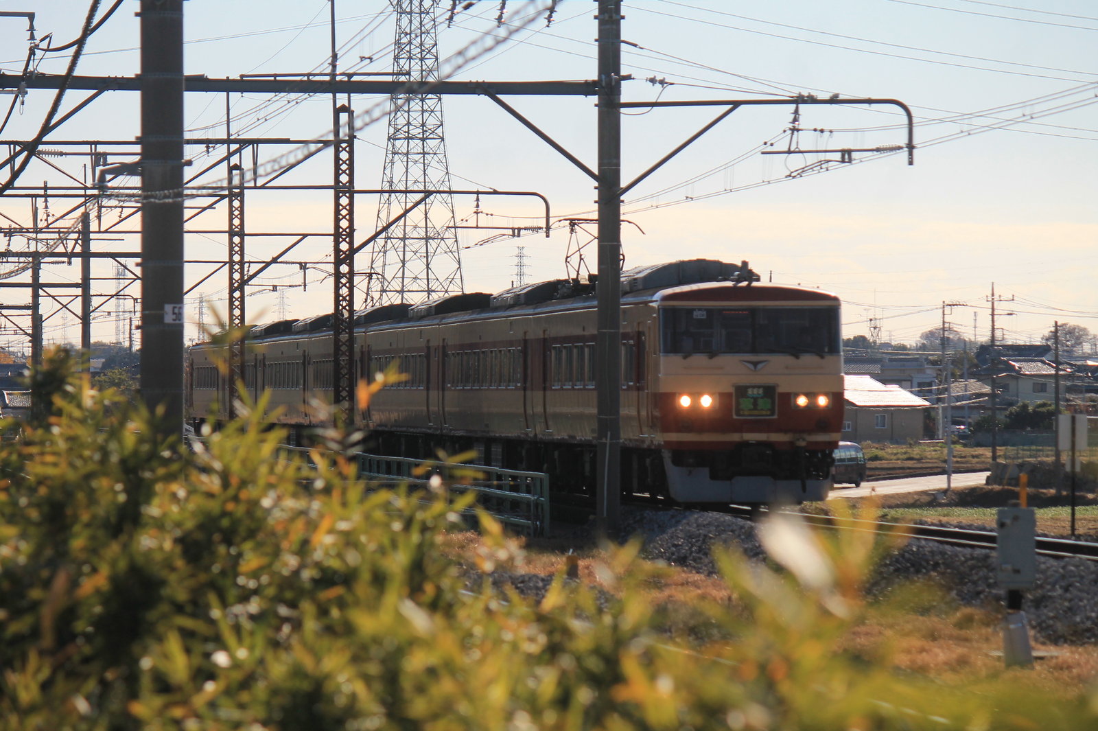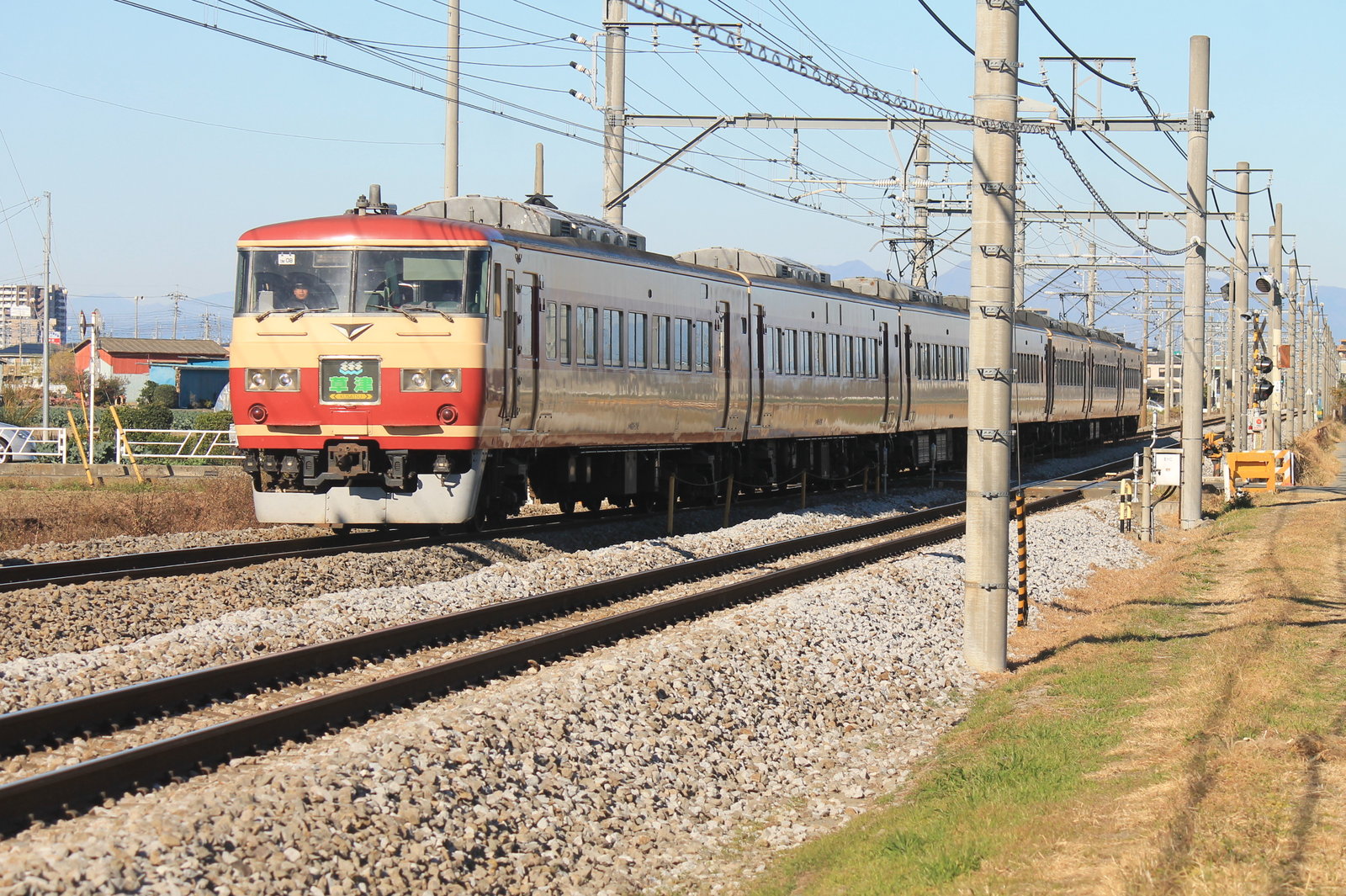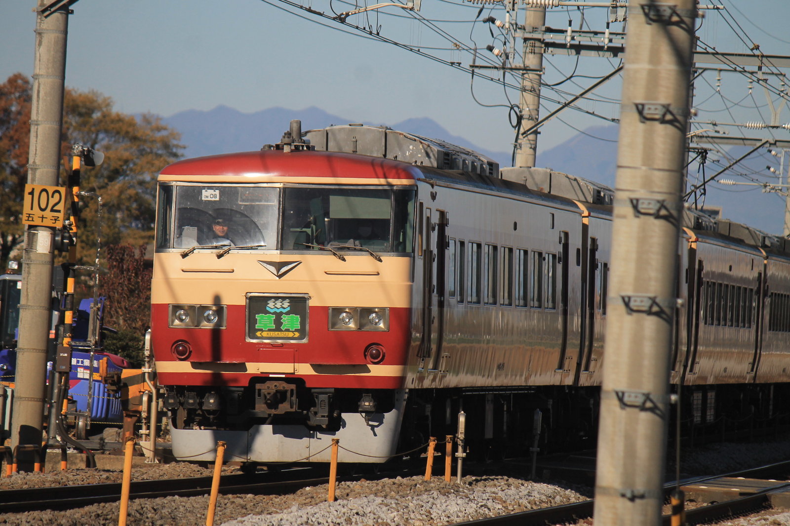 それから瞬く間に下り線から185系の特急草津31号がやってきた。この185系は、157系時代の塗装のあずき色とクリーム色のツートンカラーでやってきたのだ。この車両はOM08編成だ。