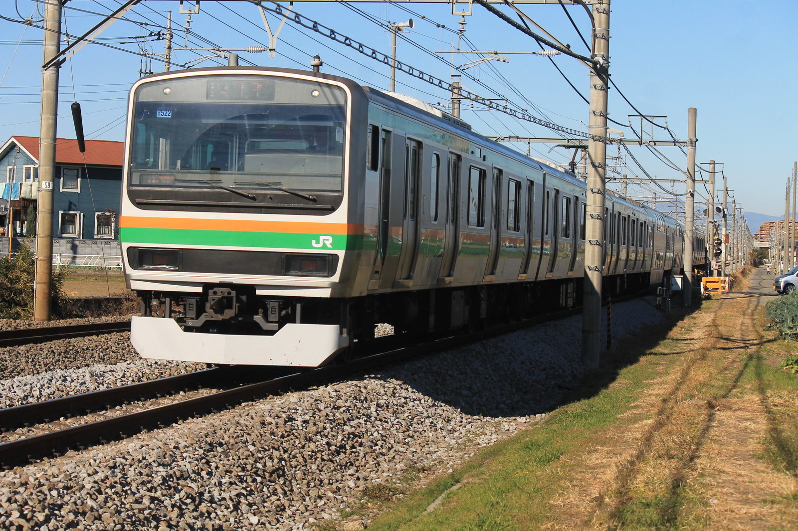 撮影地に着いた。有名な岡部〜本庄間とは少し違う場所であるが見通しが良いのでここを選んだ。まずやってきたのはE231系(U522編成)の普通列車だ。作品を見ると影ができてしまう。しかしながら、車両に影が入らないのでこれでも良しにしようかと思う。ISOは200にして、絞り優先モードで撮影をすることにした。