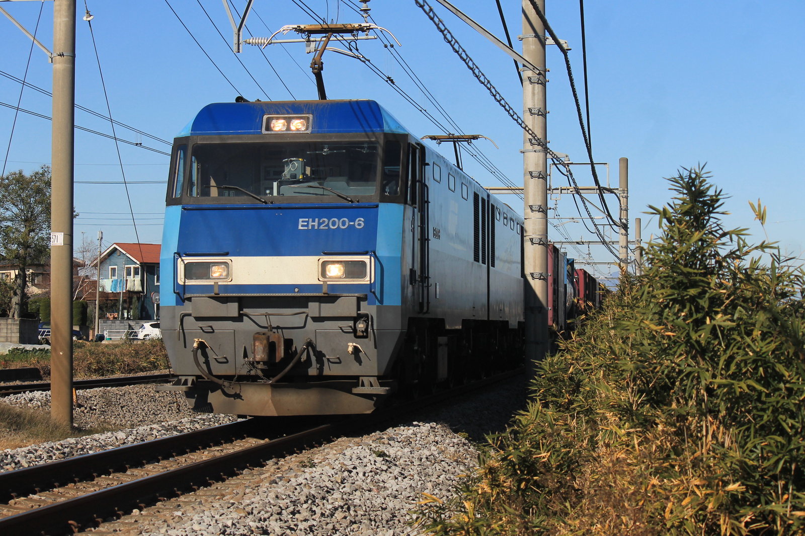 そしてこれから10分後にいよいよ211系がやってくる。その前にEH200形牽引の貨物がやってきた。ここは草が多いので影を防げるかもしれないと思い、少し離れた場所で撮影をした。