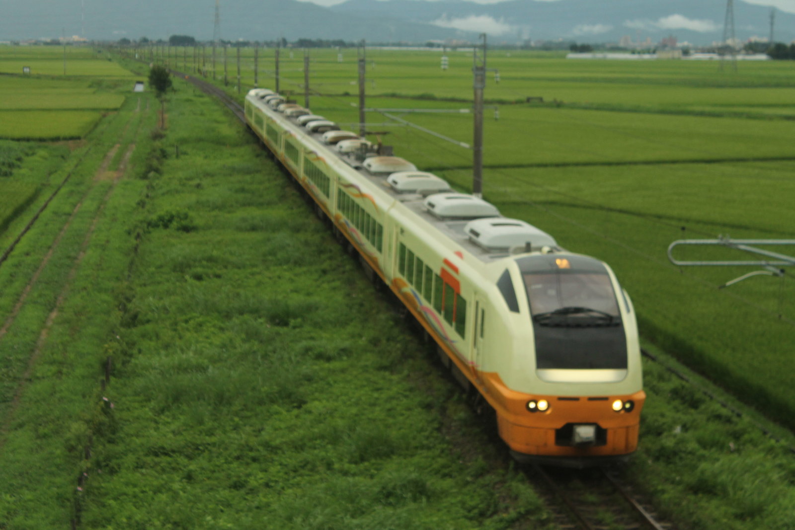 こちらの写真は6月14日に常磐線の羽鳥〜岩間間で撮影をしたE653系の4両編成と7両編成の11両編成だ。ここは跨線橋の上から緑色の水田を綺麗に写したものだ。3月に行った秋田県の富根〜二ツ井間や8月に行った山形県の鶴岡〜藤島間の撮影地にも似ている。このような姿が見られなくなる可能性も高い。この日は、十王→上野間で団体専用列車が走り、上野から勝田への回送列車を撮影をした。1997年からの風景が見られなくなるのは少しさびしいものだ。E653系は今後ははえぬき、つや姫、あきたこまちの産地で走ることになりそうだ。