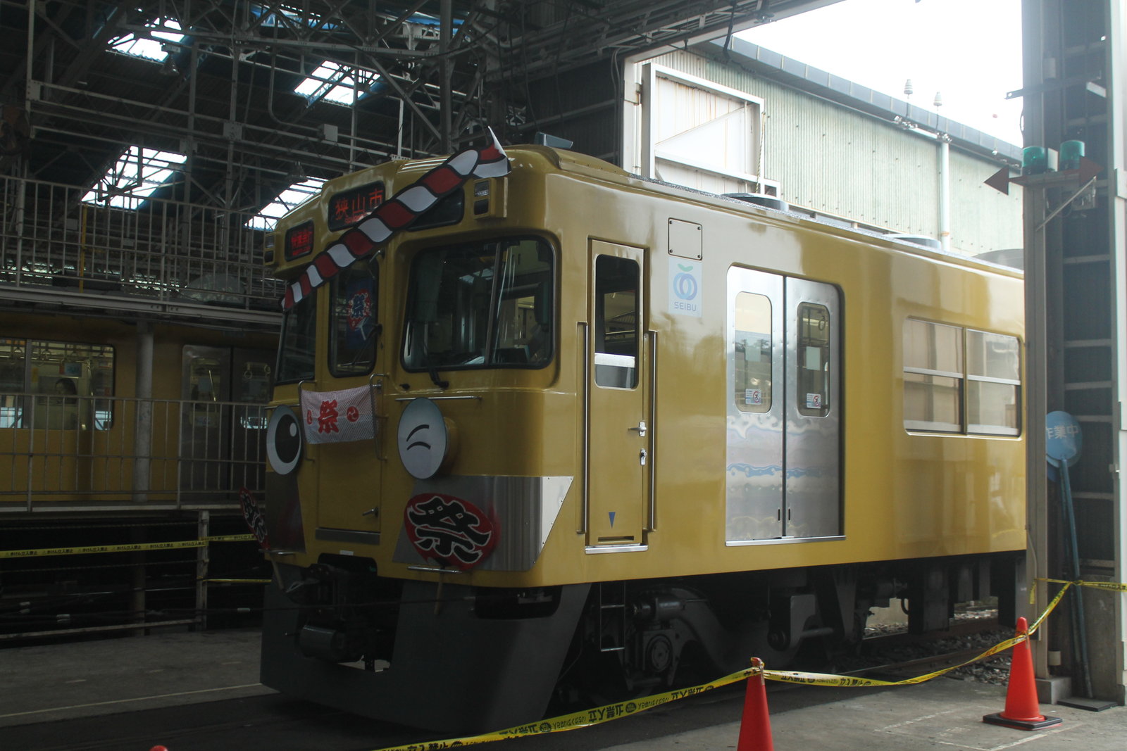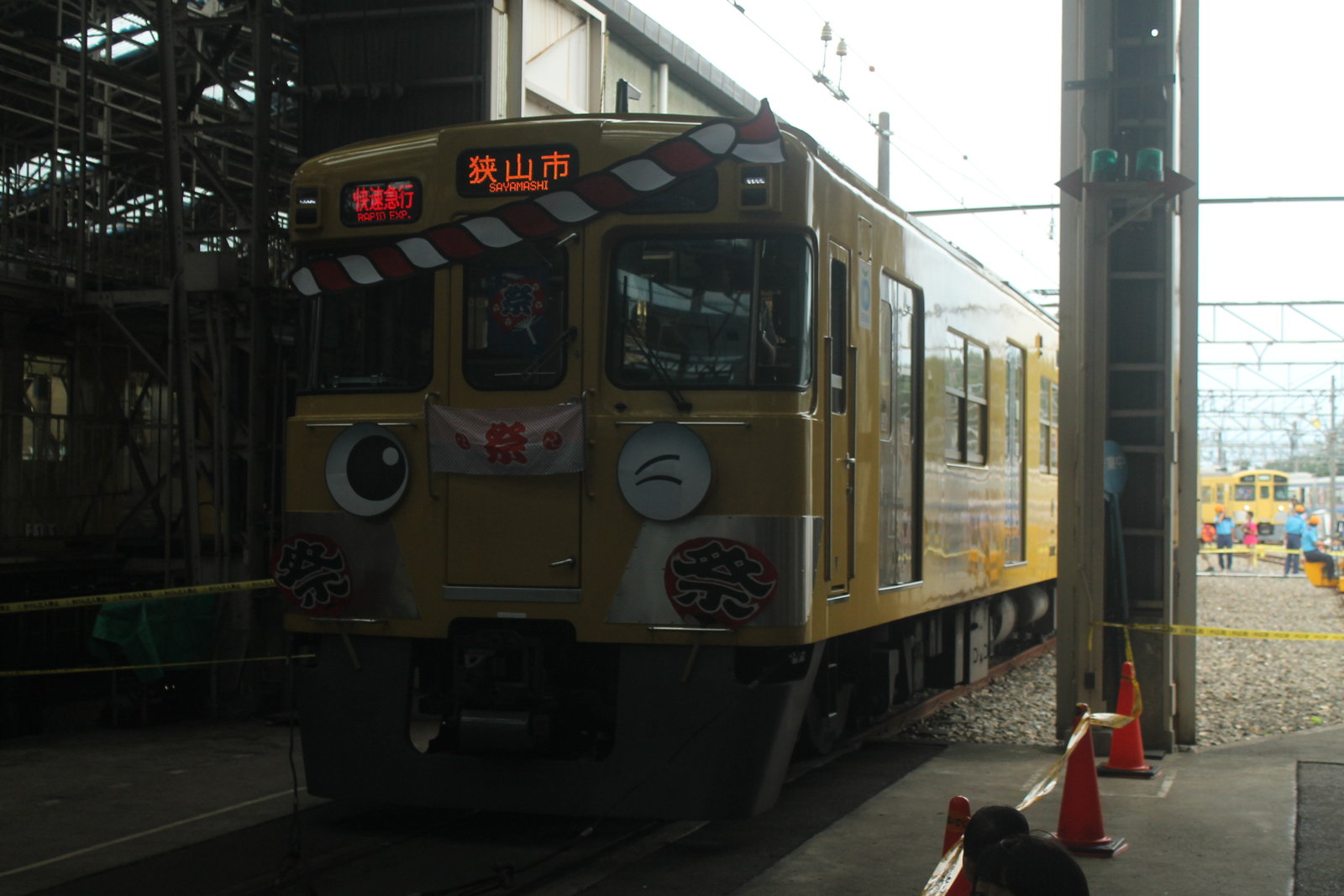 車庫の庫内では2000系の2両編成が綱引き大会に参加をしていた。2000系が目なども付けられてかわいらしい顔になっている。行き先は「快速急行 狭山市」行きだった。西武新宿線の快速急行も2012年の種別見直しのダイヤ改正で廃止になった。