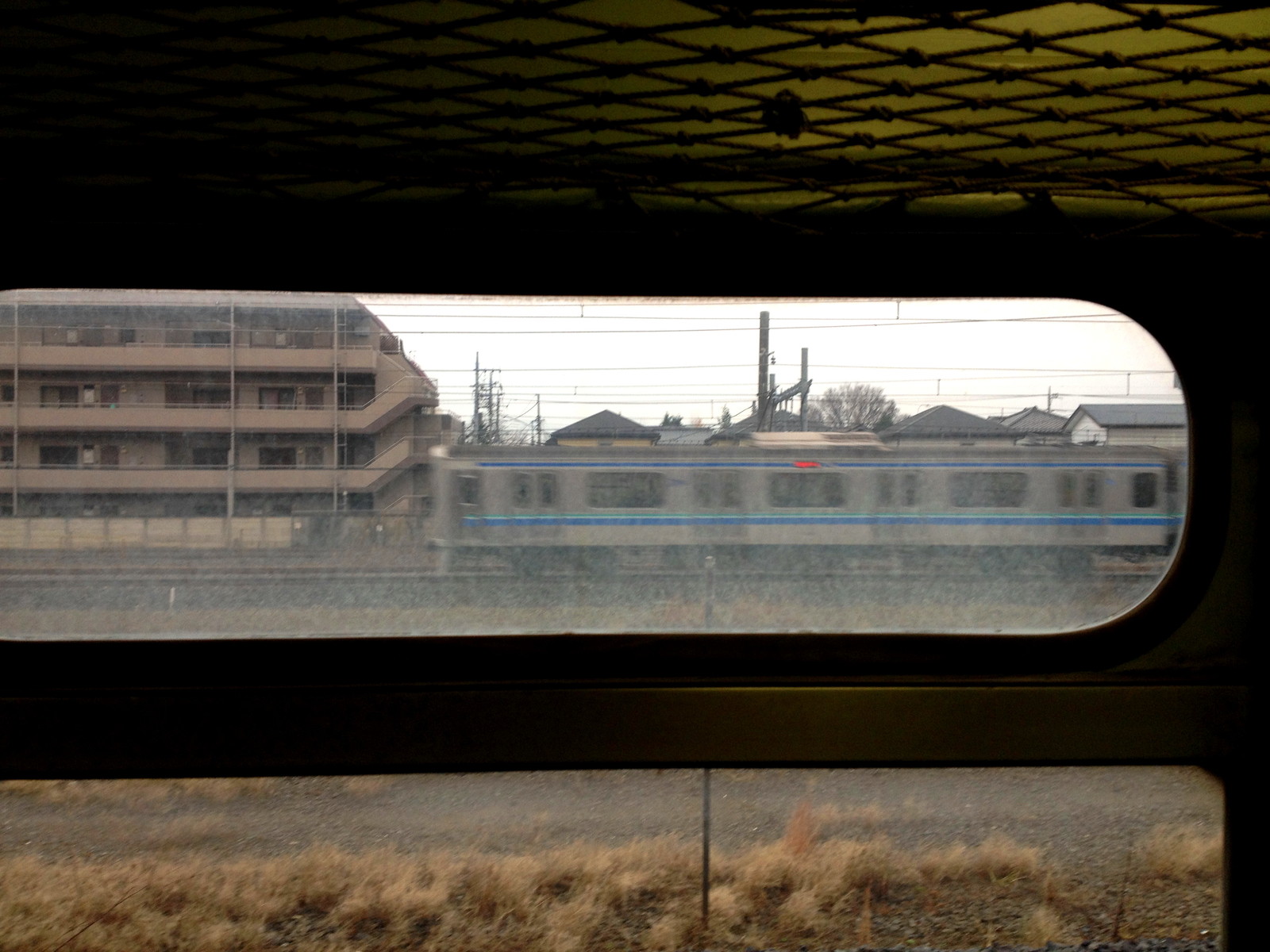 車内から撮影をした埼京線・川越線を走るりんかい線の70-000形だ。鉄道博物館のキハ11形からとわかるように丸い窓枠と糸の網棚も入れてみた。このキハ11形にいたのはごくわずかだったが、室内を見学をする機会が少ない車両なので、貴重な体験を味わうことができた。確かにこの車両は名古屋のリニア鉄道館にも展示されていたが、室内公開はしていなかったような気がする。リニア鉄道館の前身の一つの佐久間レールパークではこの車両の室内を見たことがある。