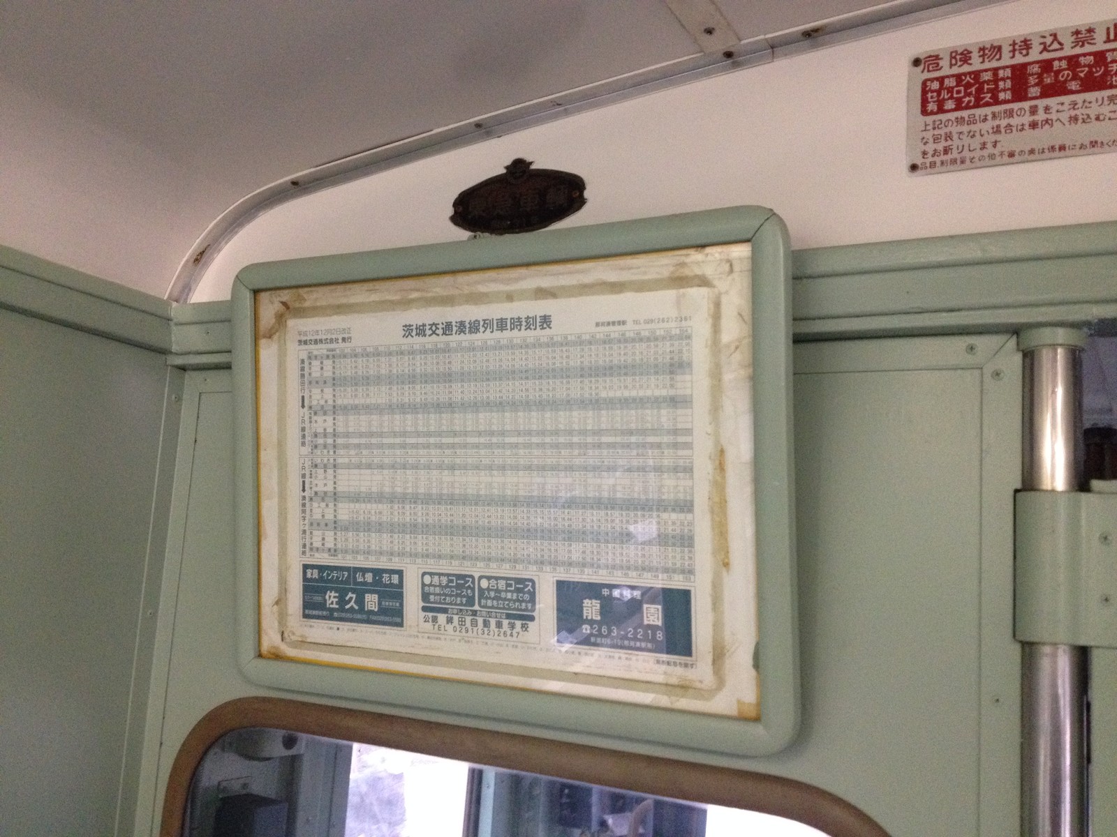 112番とは茨城交通時代の番号のキハ11形の2号車で、車内には茨城交通時代の時刻表もある。今ではひたちなか海浜鉄道となって、バラエティに富んだ車両を入れている。ここでかつての面影を感じさせた。というよりもそのひたちなか海浜鉄道が同じ番号の形式のJR東海のキハ11形を購入をし、間もなく営業運転を開始をするのは何か偶然かもしれない・・・