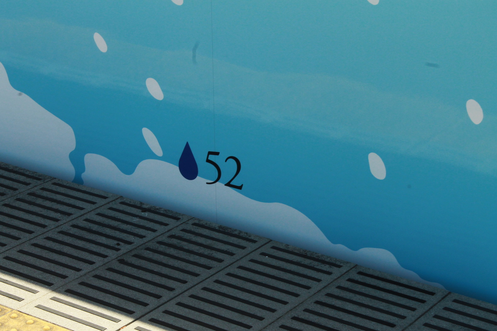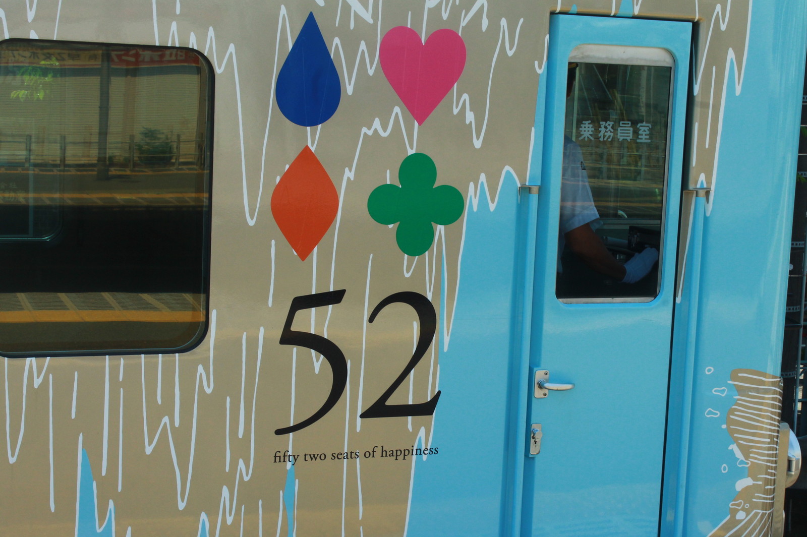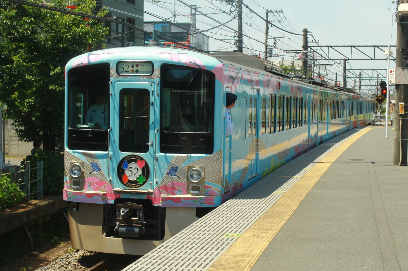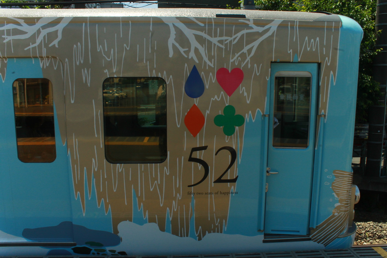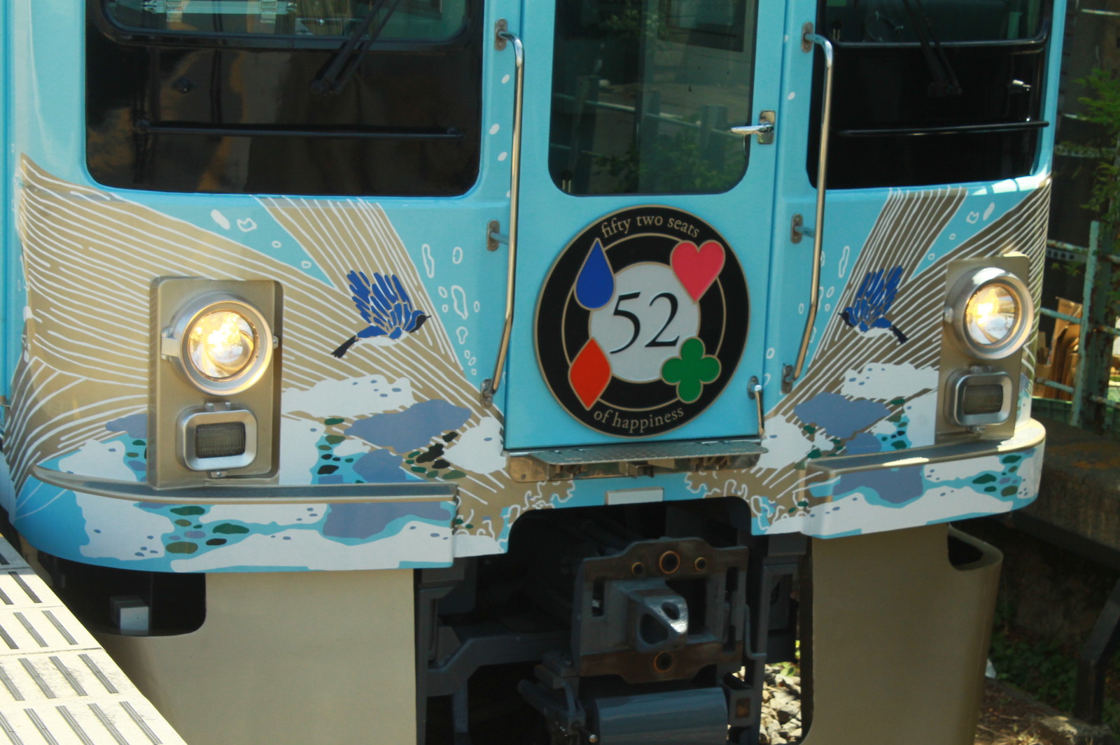 停車時間は約3分だ。色は水色であるが、これはあの「荒川」に合わせたものだ。そう、特急あらかわのあの荒川だ。葛飾区や足立区、江戸川区などの荒川でなく、秩父の荒川だ。これと秩父の四季を描いている。4号車は雪景色、3号車が紅葉、1号車は桜などが書かれている。これまで西武の秩父方面の雄の4000系がこのような形で変わってしまった。車両編成は4009と4010で3・4号車は4009、1・2号車は4010だ。車両の下にも52と書かれている。