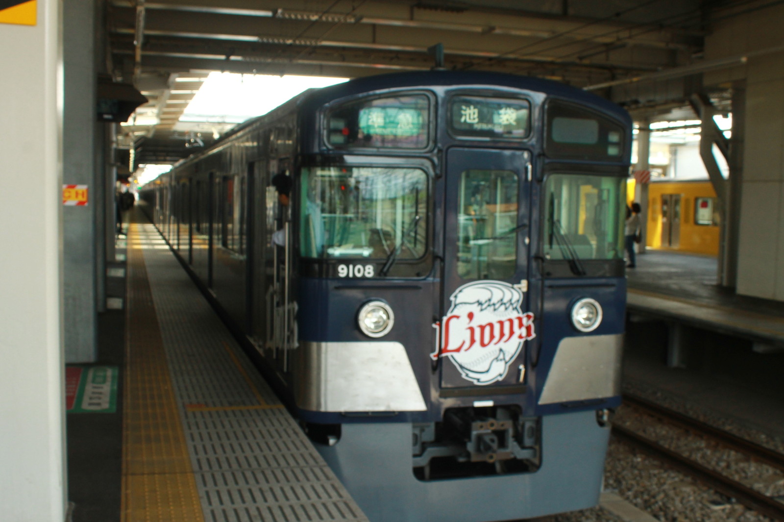 最後に紹介をするのが、埼玉西武のラッピング車両の9000系9108編成だ。主に池袋線の優等列車で走る。色も埼玉西武のカラーに合わせた紺色になっている。かつては3000系で走っていたが、3000系が廃車になってからは9000系で走るようになった。つり革は埼玉西武の選手が紹介されている。