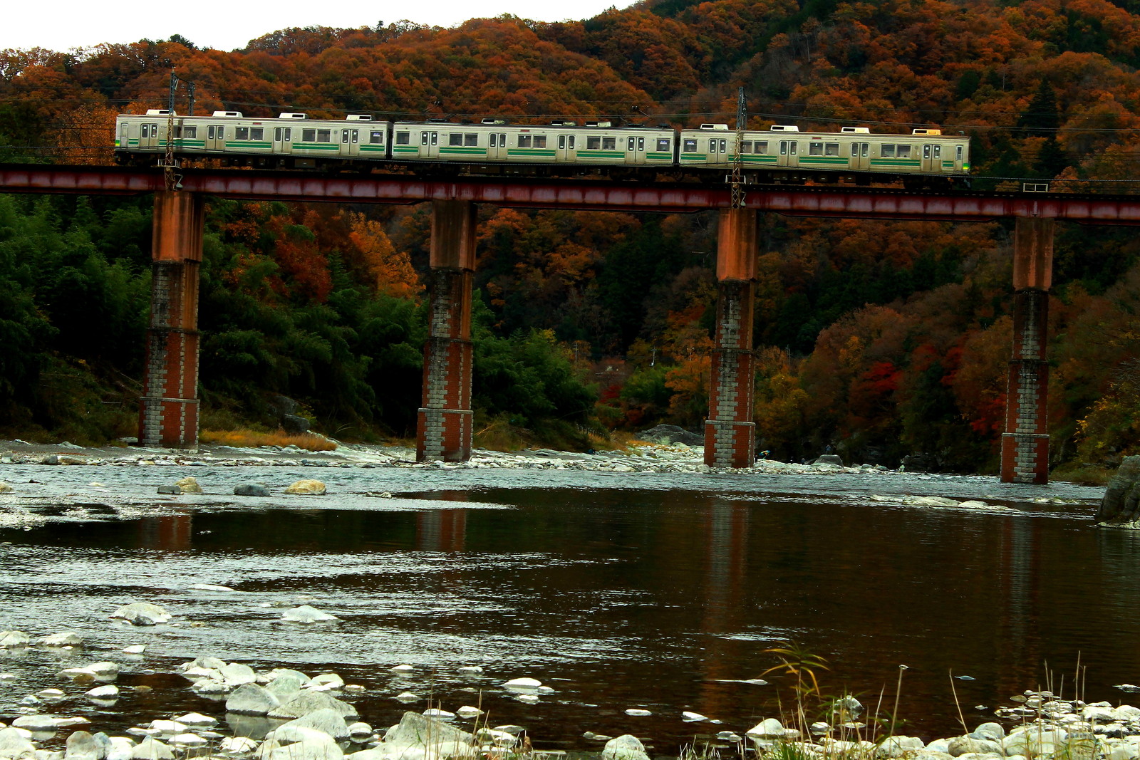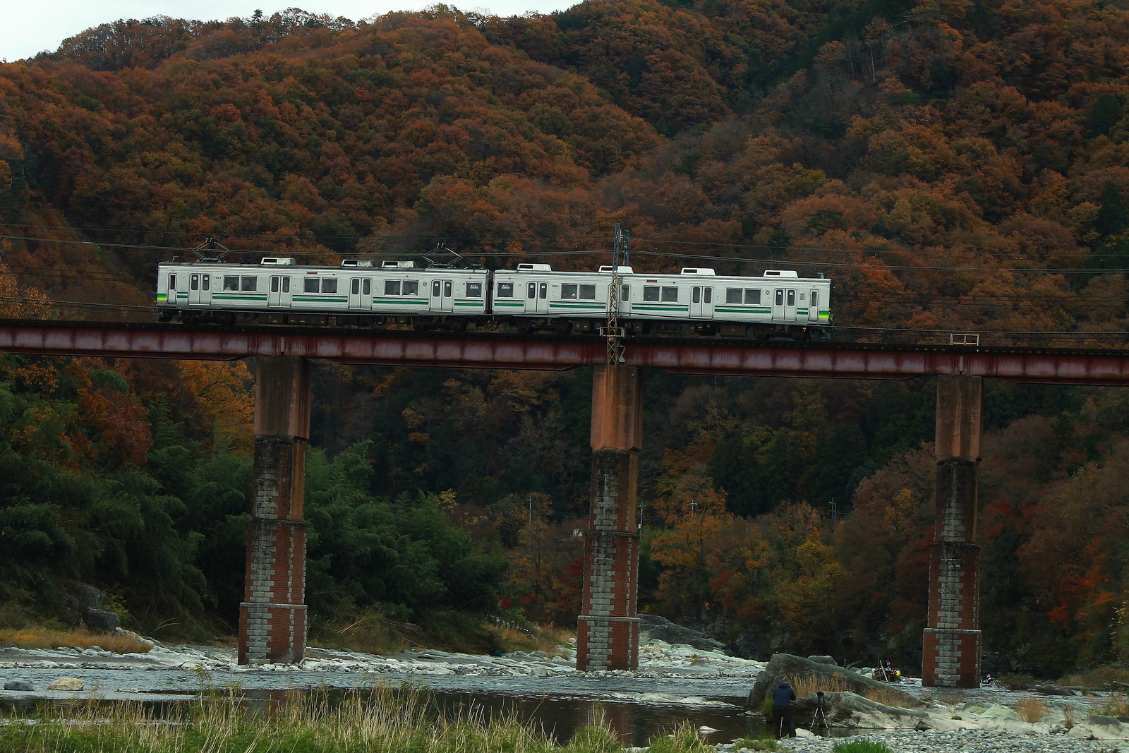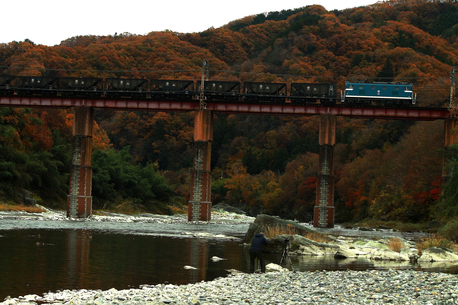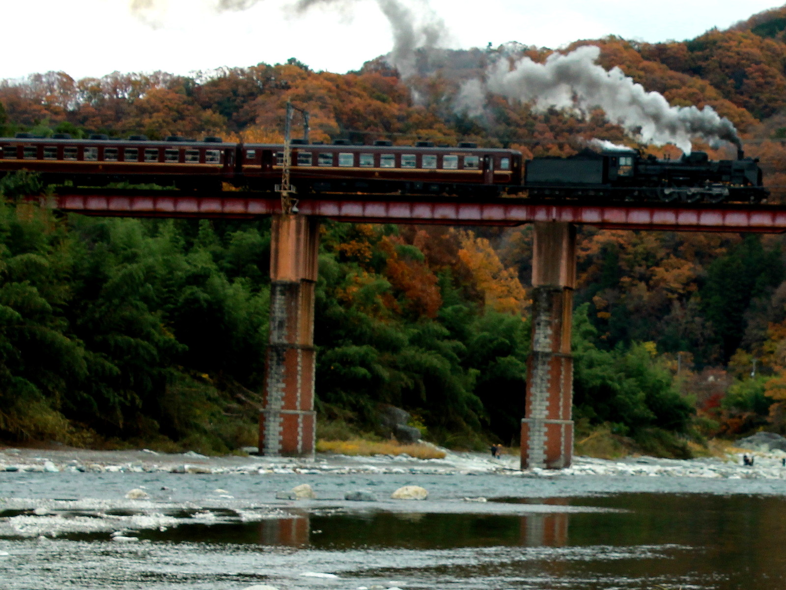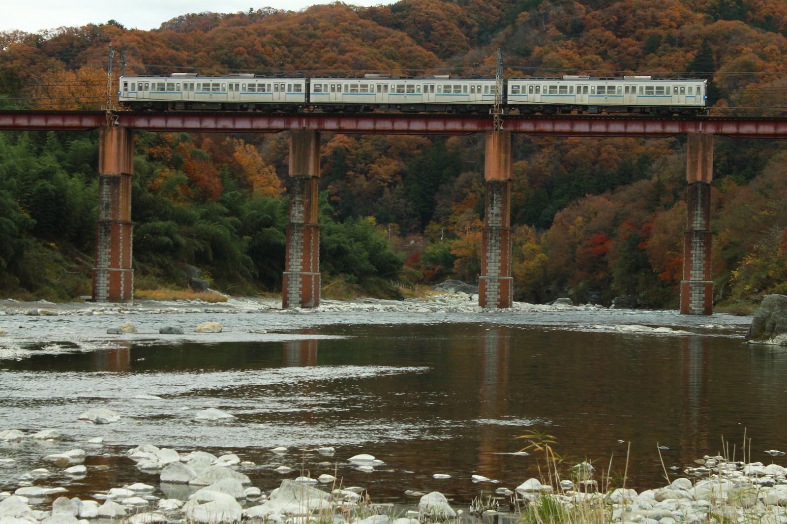長瀞駅からは自転車を使い、撮影地を目指す。定番の荒川のアングルだ。元々都営三田線を走っていた6000系を改造をした5000系、東急大井町線などで使われた8090系を改造をした7500系、そして同じく東急8090系からの改造車両の7800系を出した。7800系は7500系の2両編成バージョンだ。都営・東急時代には荒川を越えたことがないので、秩父鉄道では荒川を越えることになる。長瀞はまさに秋深しという感じだ。