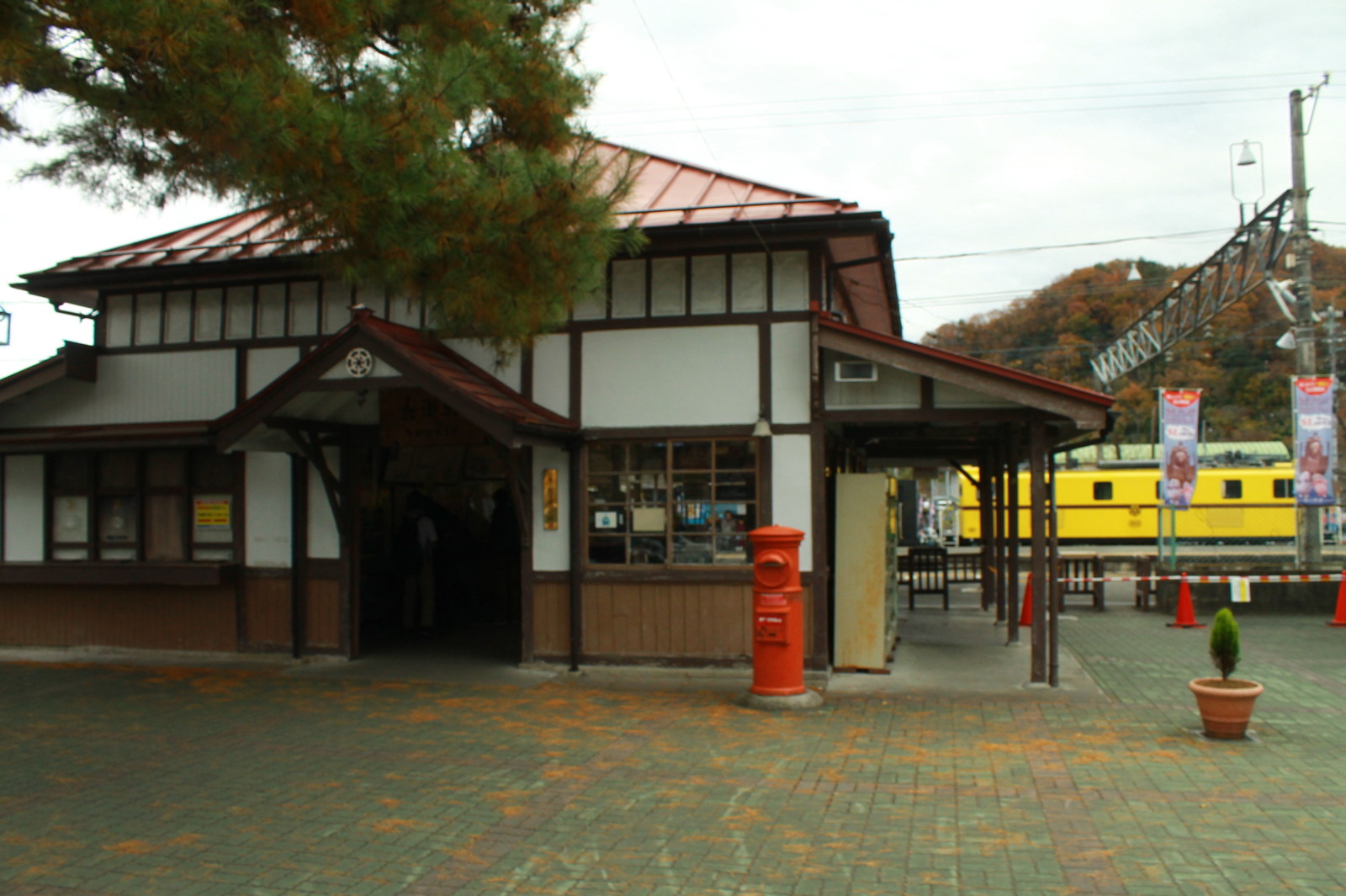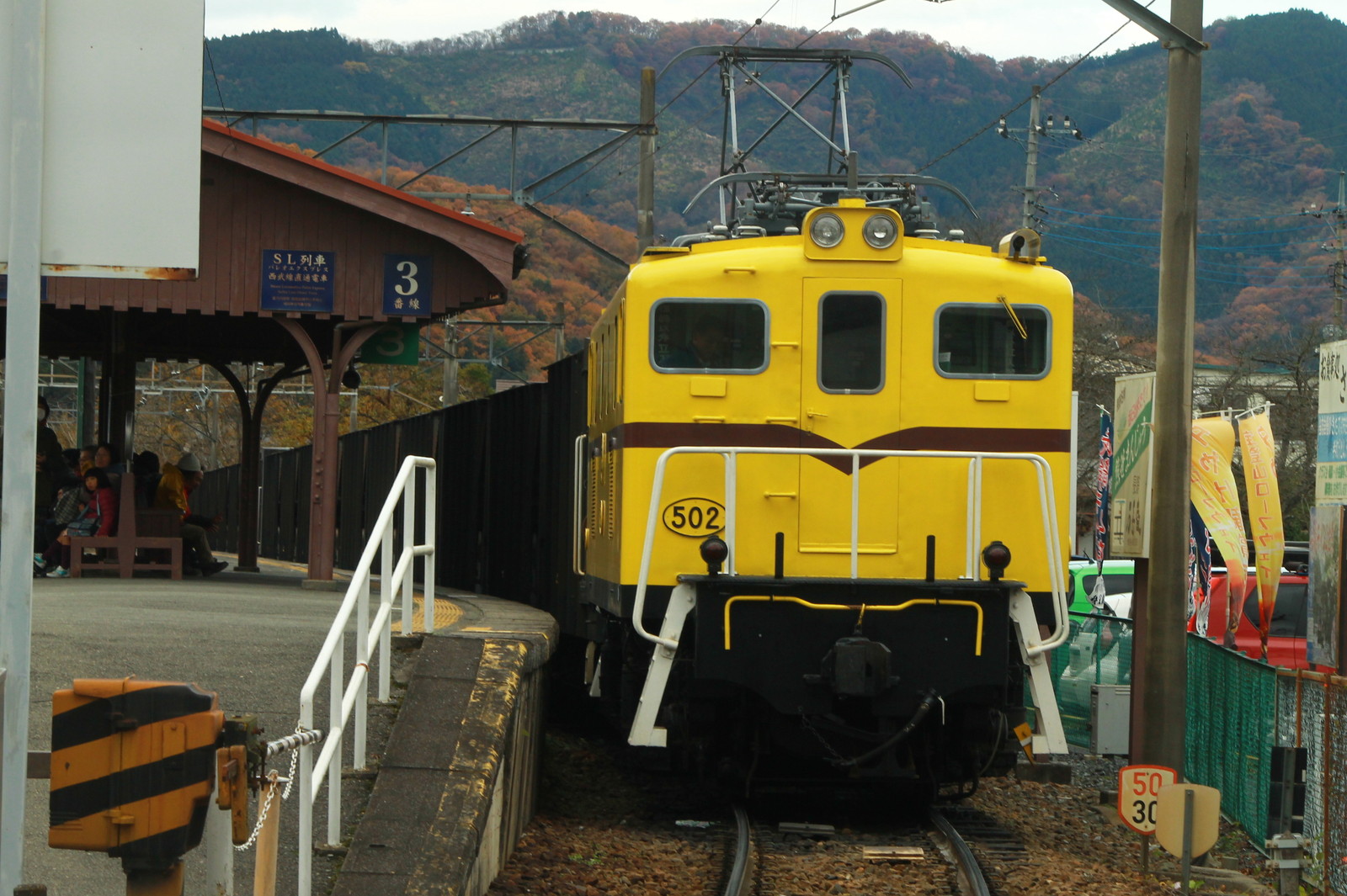 悔しくて、長瀞駅に戻る。三峰口発は絶対に成功をさせたい。長瀞駅では、秩父鉄道のデキ500形の502号機が止まっていた。この車両、黄色地で茶色の帯という1980年代の秩父鉄道の車両と同じ色になっている。関東の駅百選に選ばれた長瀞駅の名物駅舎とデキ502号車を入れてみた。