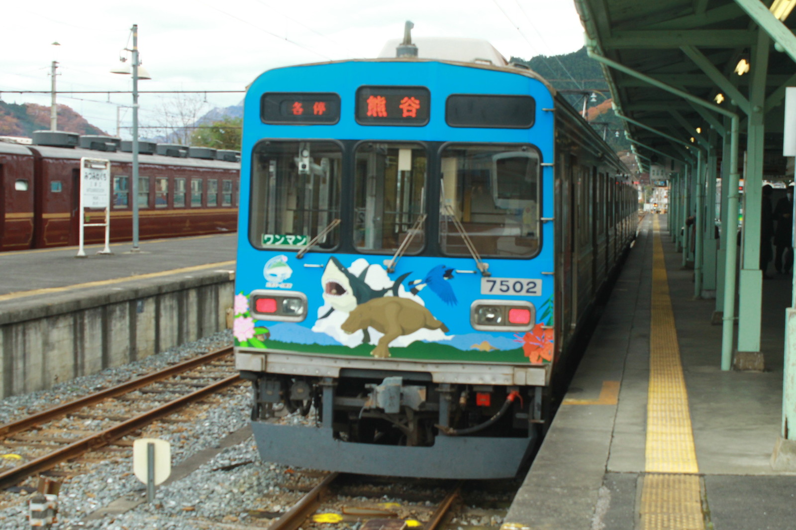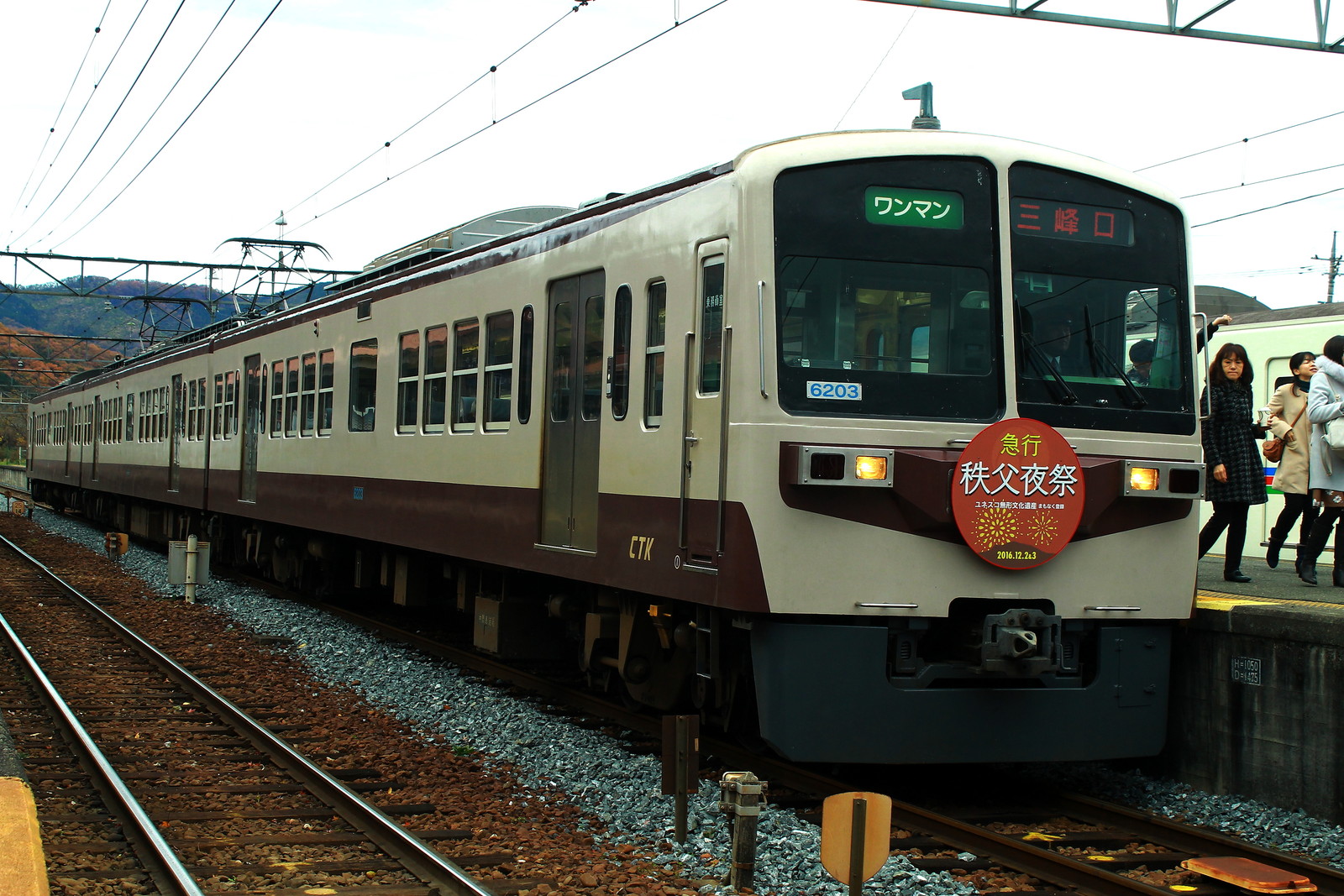 長瀞駅では急行秩父路の6000形車両を撮影をする。急行秩父夜祭のヘッドマークをつけている。元々西武の101系だった車両だ。その車両が2ドアになった。