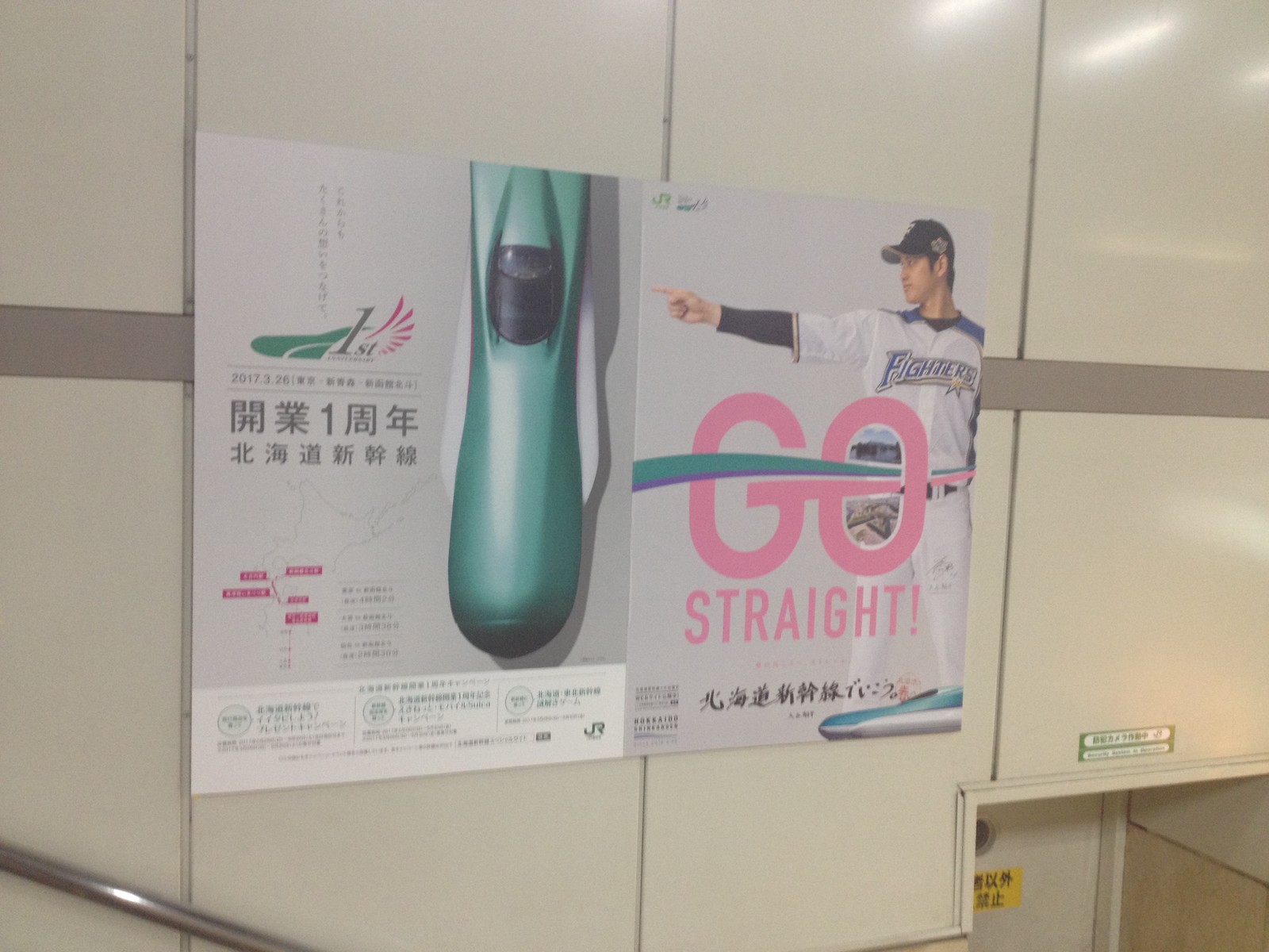 北海道新幹線のH5系と秋田新幹線のE6系のはやぶさ・こまち29号だ。北海道新幹線のH5系は今年で2年目になるが、私は北海道新幹線のH5系に書かれたこの北海道の絵が好きだ。まさに北海道から本州へのスピード感がある絵が良いのだ。北海道新幹線の広告には日本ハムファイターズの顔でいまや日本球界最大の顔ともいえる大谷翔平選手が出ている。北海道新幹線の広告という点ではまさに絶好の適役だろう。