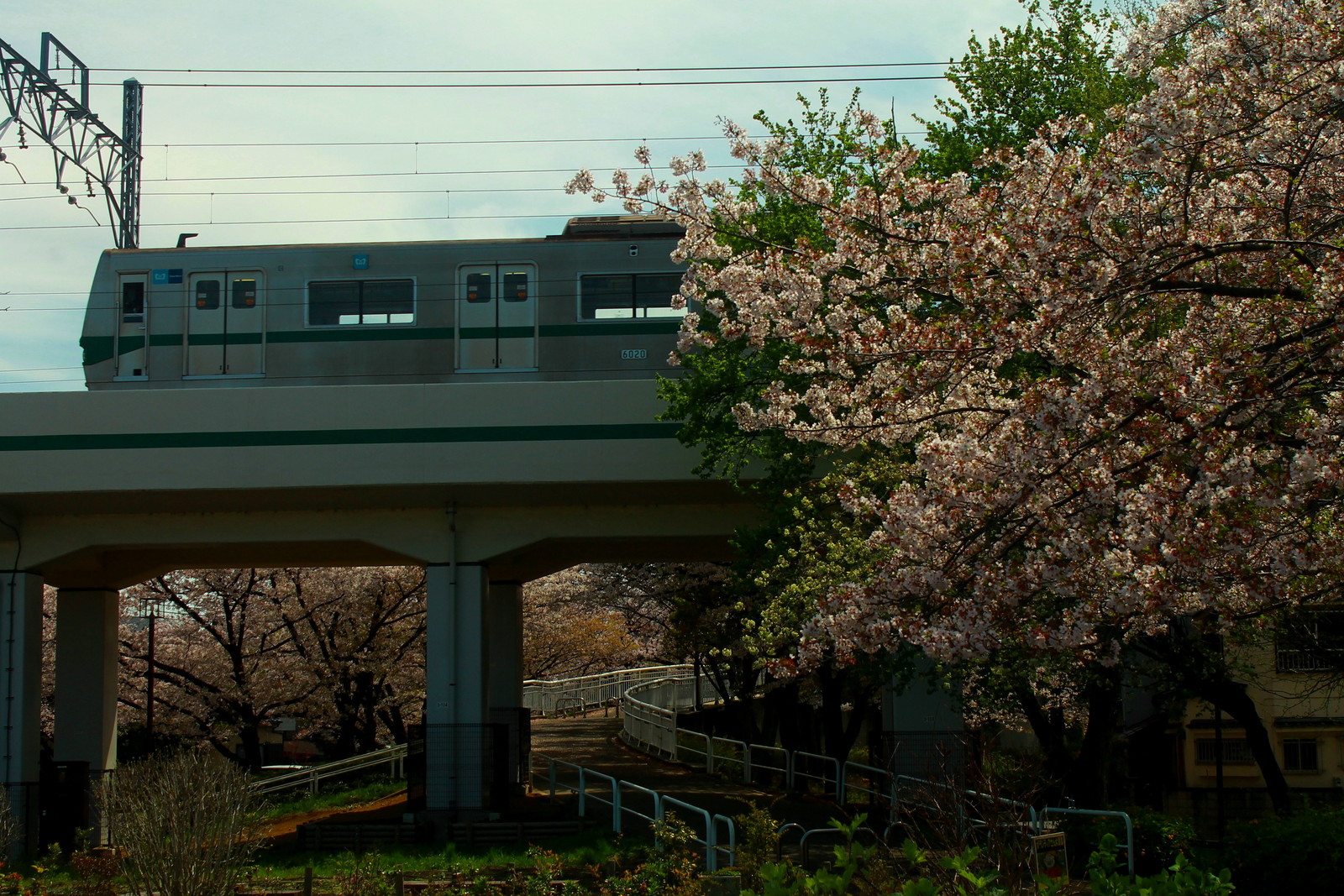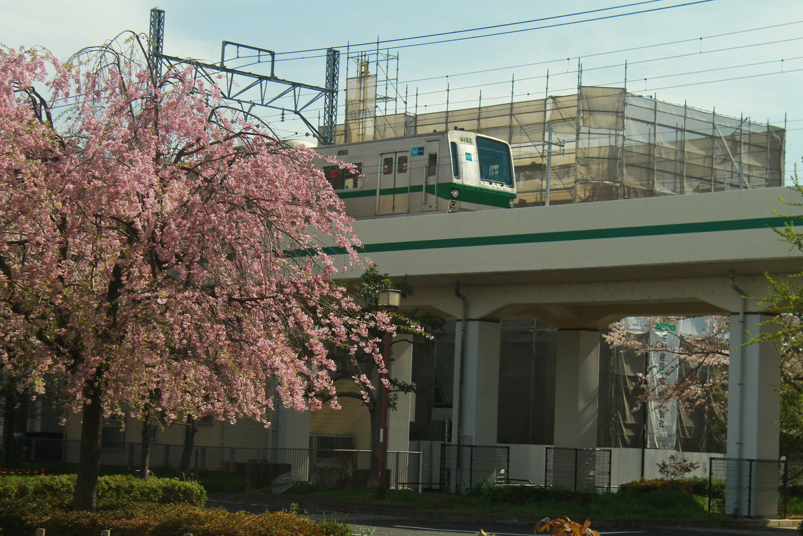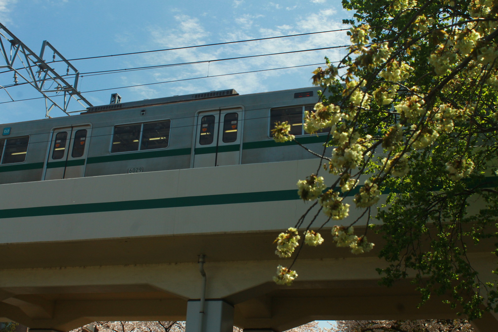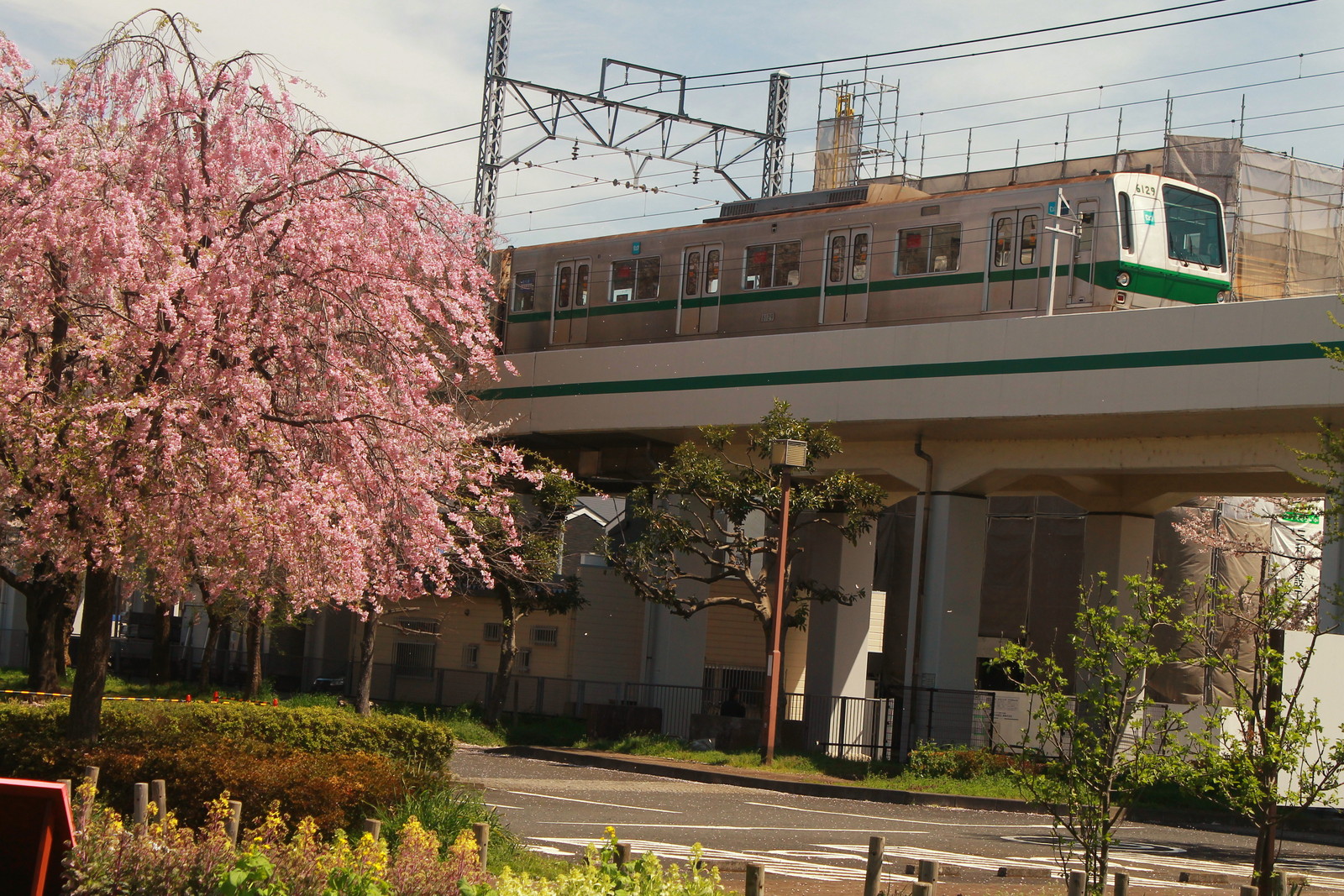 この日2本目の6000系は6120編成だ。手前にあるのは緑の桜は葉桜ではなく、白と緑のさくらだ。