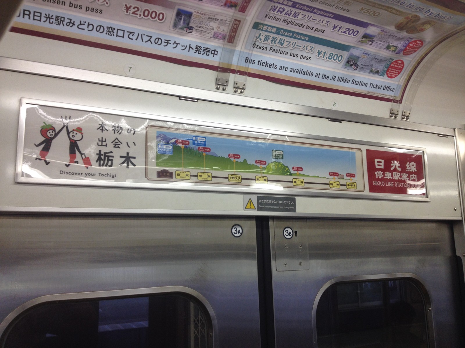 日光線は、ドア上の広告に路線図に標高や日光連山などの見える山などが描かれている。これを見ると鹿沼駅から先に一気に標高を上げていくのがわかる。車窓からは日光連山の男体山などが見られることがわかる。
