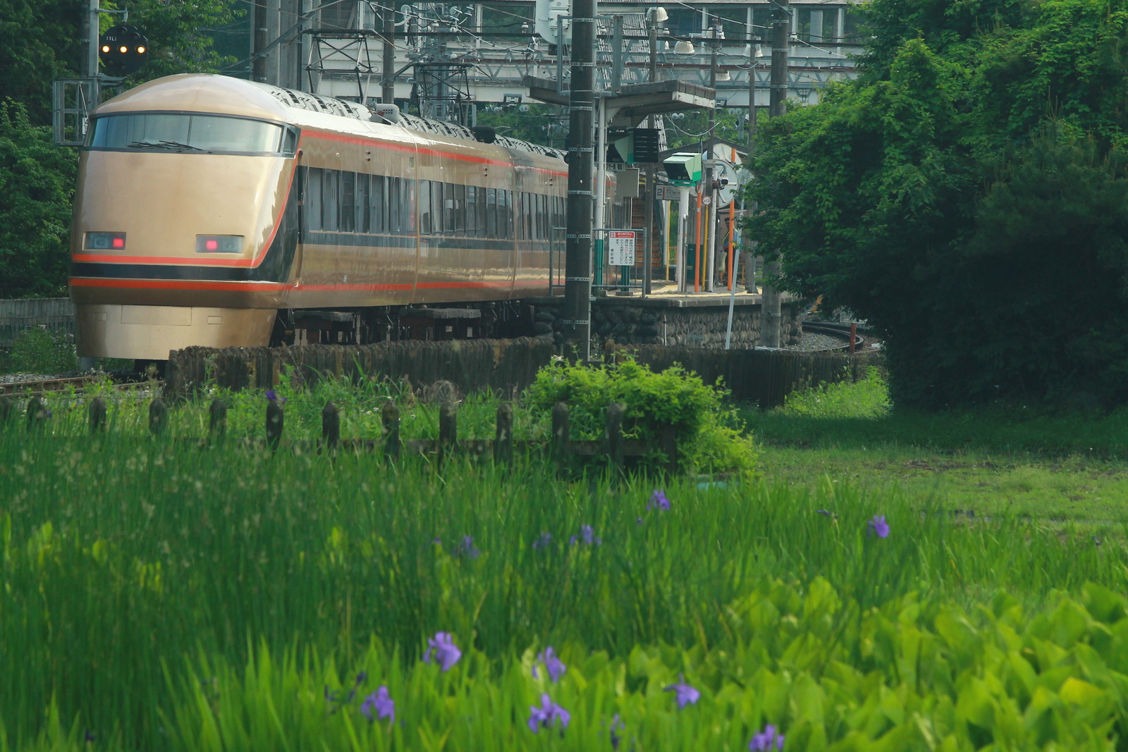大桑駅では新宿行きのスペーシアきぬがわ6号は別の列車と交換のために止まるが、望遠を使い、あやめとスペーシアを撮影をした。