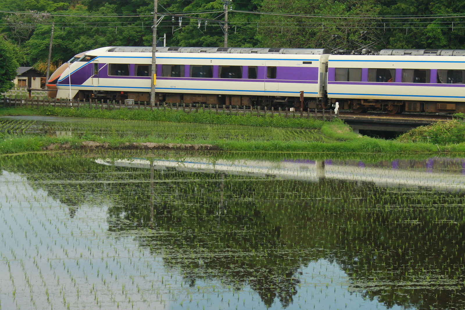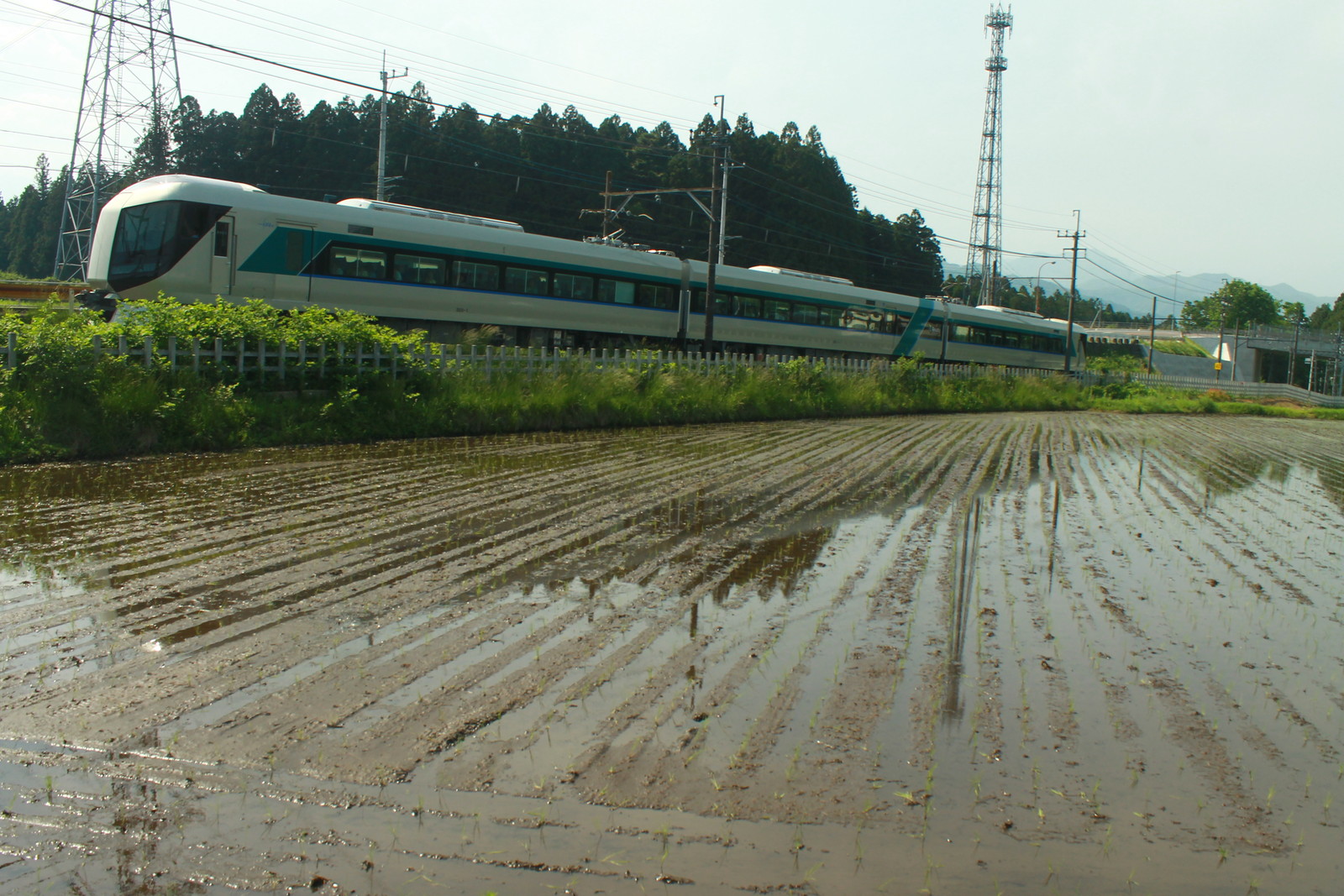 この少し南の日光たまり漬け本舗の店の近くだ。この時季ならではの水鏡を狙ってみることにした。500系自体は少し中途半端になった。鉄塔を加えて水鏡になった。鉄塔を加えても見栄えは今一つという感じになりそうだった。