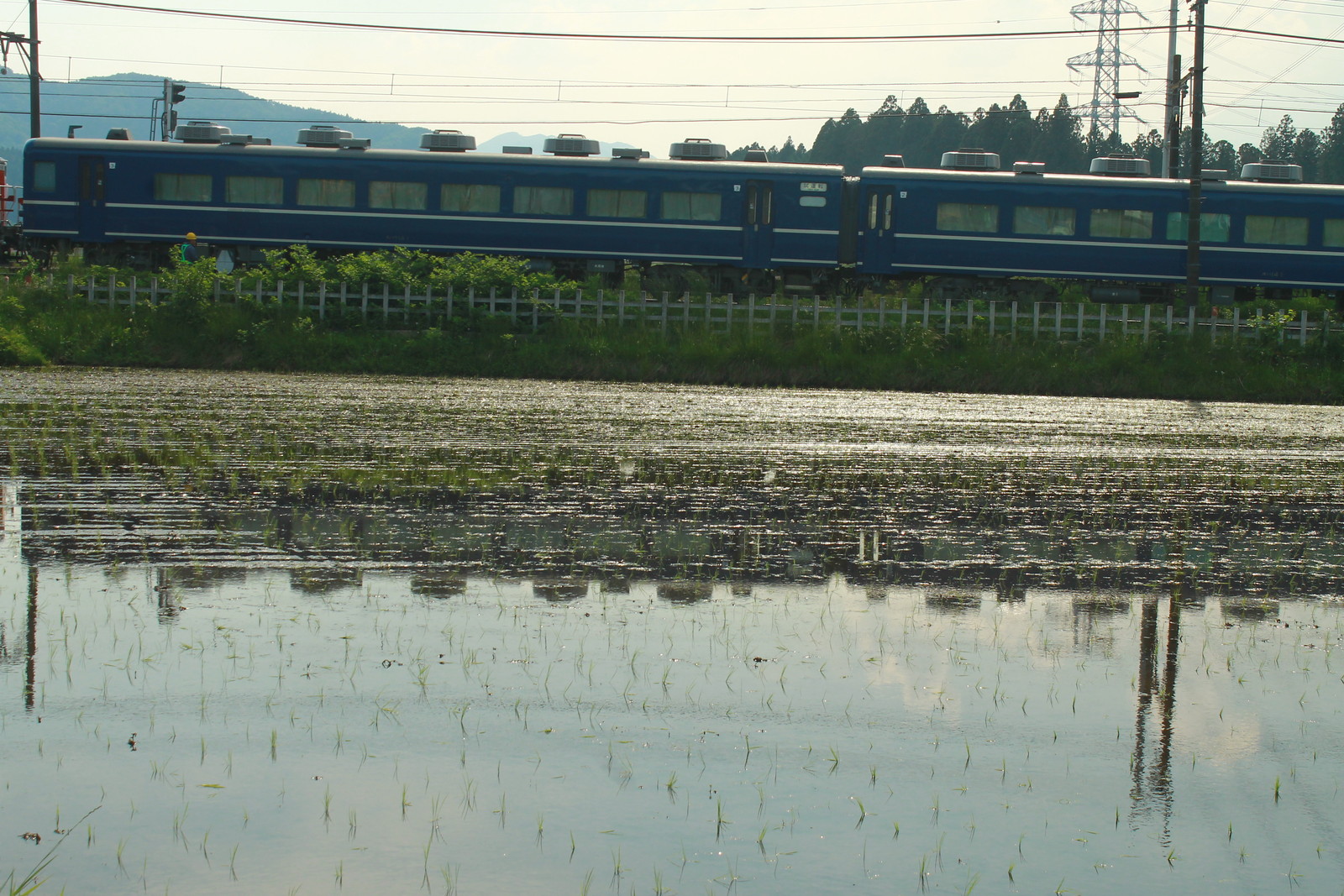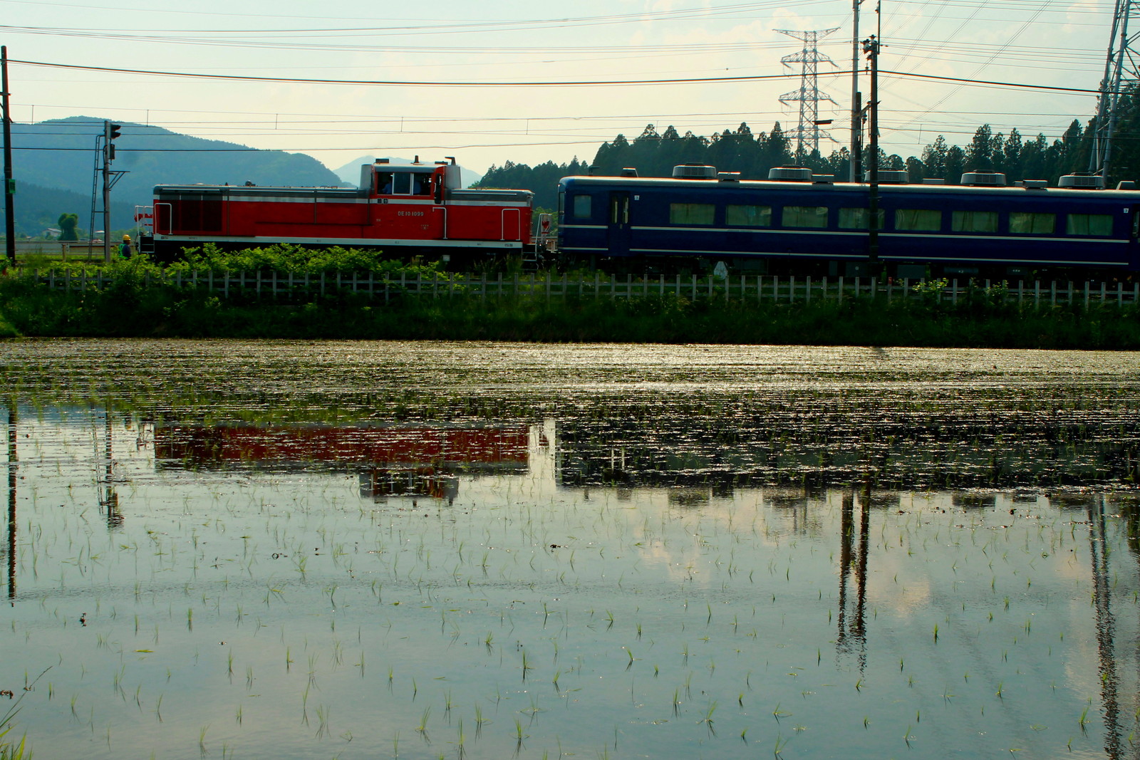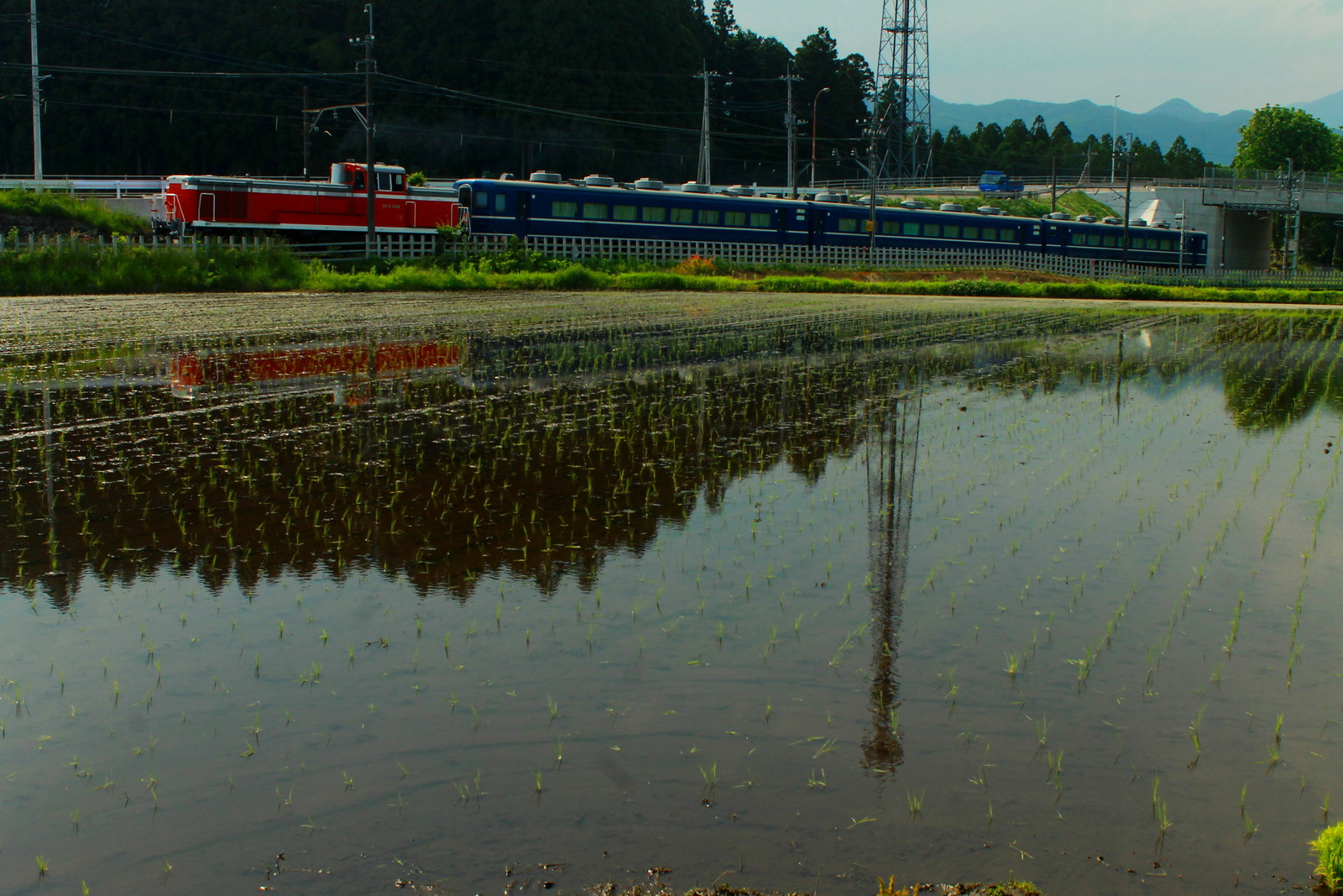鉄塔を入れてみたが、水鏡でDE10形1099号機牽引の14系客車を撮影ができた。SLでなかったもののこのような試運転はなかなか見られないものだから貴重かなと思った。鉄塔はどう見えるのだろうか・・・でも季節感のあるものをここで撮ってみた。