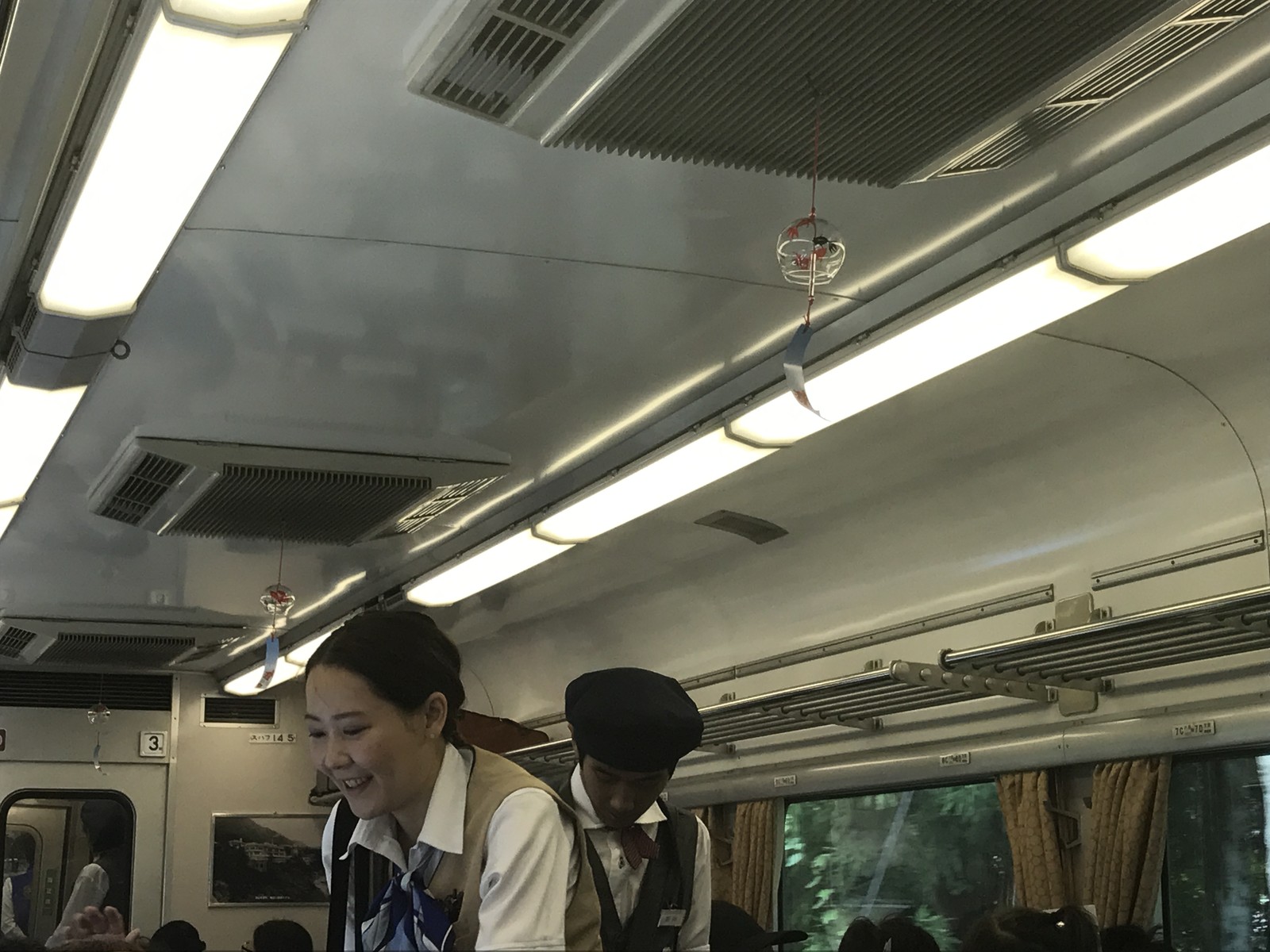 SLの車内では、アテンダントさんが、冊子を配ったり、乗客に記念写真のサービスを行ったり、何かあわただしい。いろいろサービスをしていきたいのはわかるが、短すぎると感じたのは確かだ。車内は設計速度の低い東武鬼怒川線をゆったりしているが、ゆったり風景を見るよりもサービスの気合が入っているということが目立つように見える。まさに観光列車という感じがするのは確かだ。東武がここまでSL大樹のサービスに力を入れてきたいと感じたのは事実かもしれない。夏らしく風鈴も写してみた。